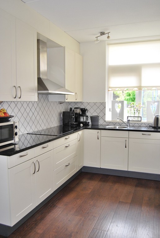 Entree, hal, doorgang naar garage waar de aansluiting voor wasmachine zich bevindt, toilet, trapopgang, woonkamer, eetkamer met deur naar tuin en terras, hoekkeuken met natuurstenen aanrechtblad, kastenwand, diverse inbouwapparatuur zoals; koelkast, vrieskast, oven, inductiekookplaat, afzuigkap en vaatwasser.
