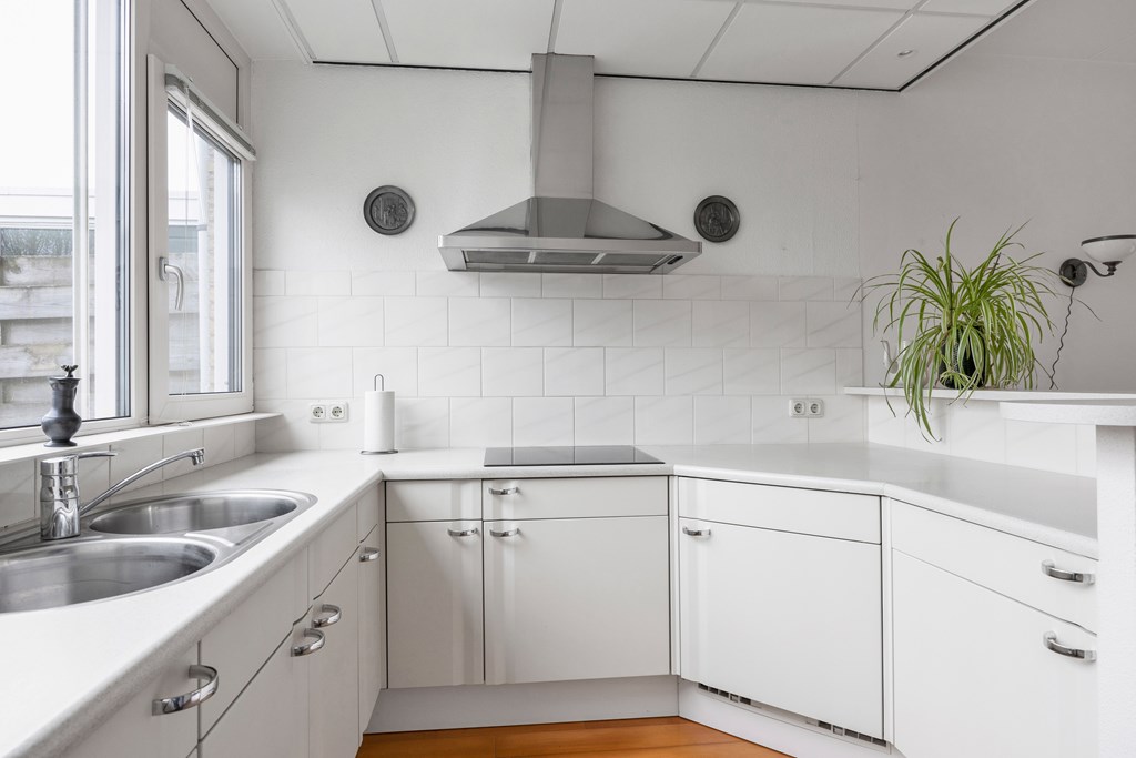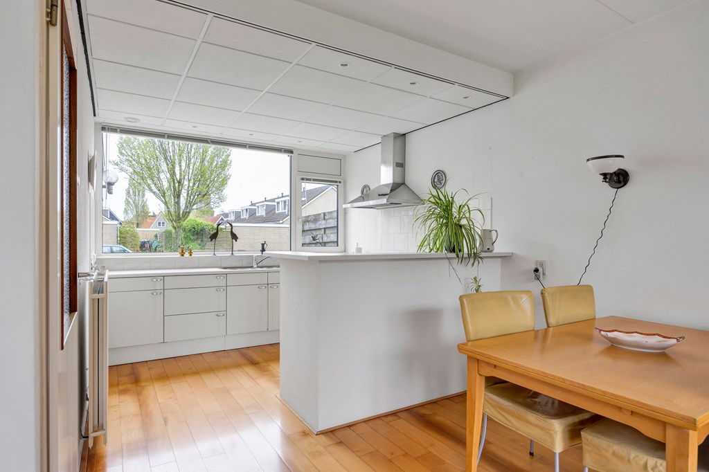 Nadat we de auto geparkeerd hebben op eigen erf, betreden we de woning via de voordeur en komen in de entree met meterkast en open kast, rechts van de entree bevindt zich de bijkeuken met aansluiting voor de wasmachine en droger, spoelbak en toegang tot de aangebouwde garage. Links van de entree is de hal met toilet, trapopgang en inbouwkast, tevens toegang tot de woonkamer met open keuken. De woonkamer is heerlijk licht door de grote raampartij aan de achterzijde, met openslaande deur naar de achtertuin op het noordwesten. De keuken bevindt zich aan de voorzijde van de woning en heeft een U-vormige keukenopstelling voorzien van een koelkast, dubbele spoelbak, keramische kookplaat en afzuigkap.