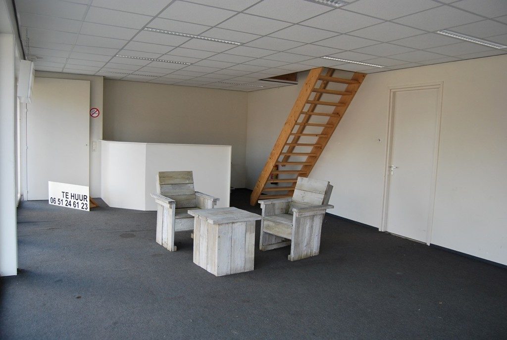 Entree, showroom, vaste trap naar eerste verdieping, werkplaats met elektrische roldeur van 5 m. breed, bedrijfsruimte met vloerverwarming van 160 m² met eigen toilet.
