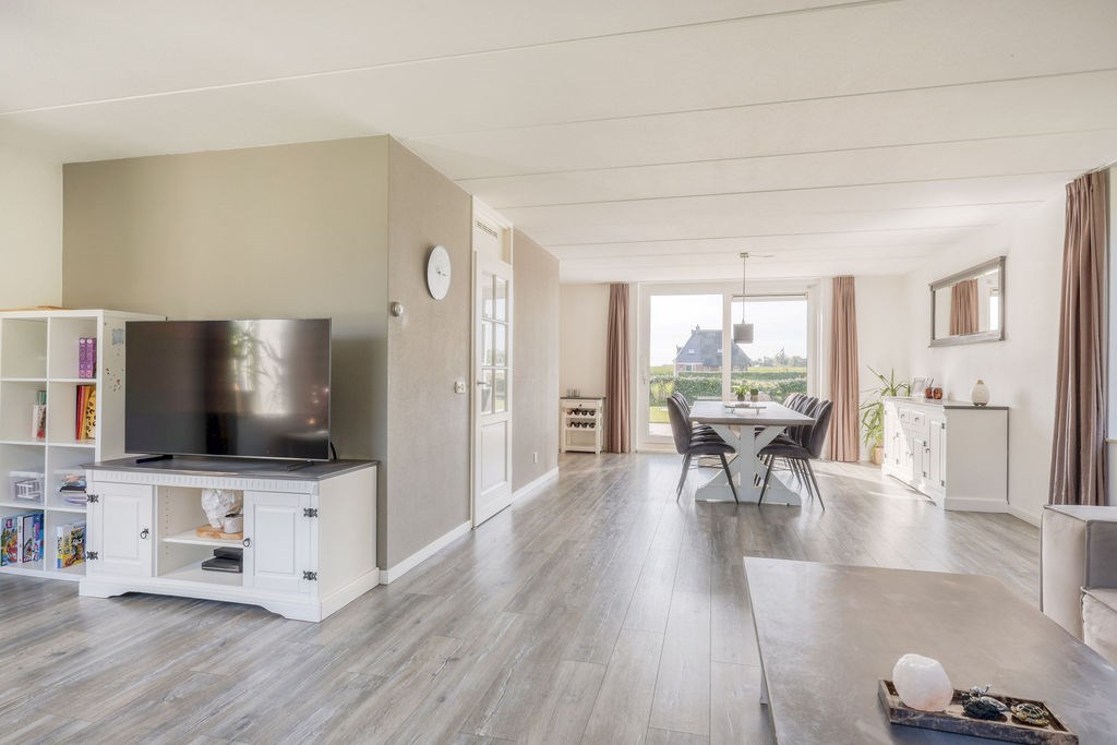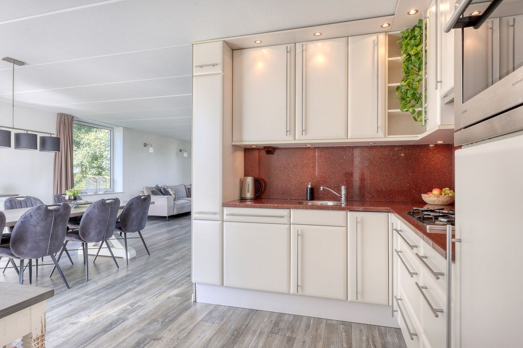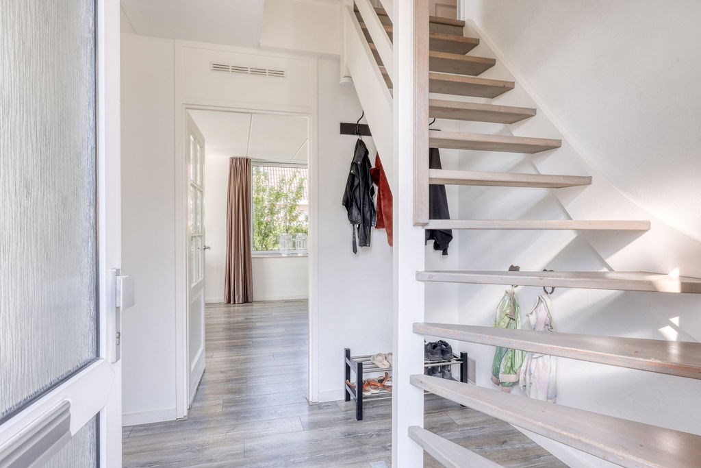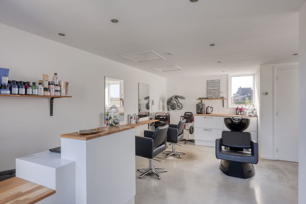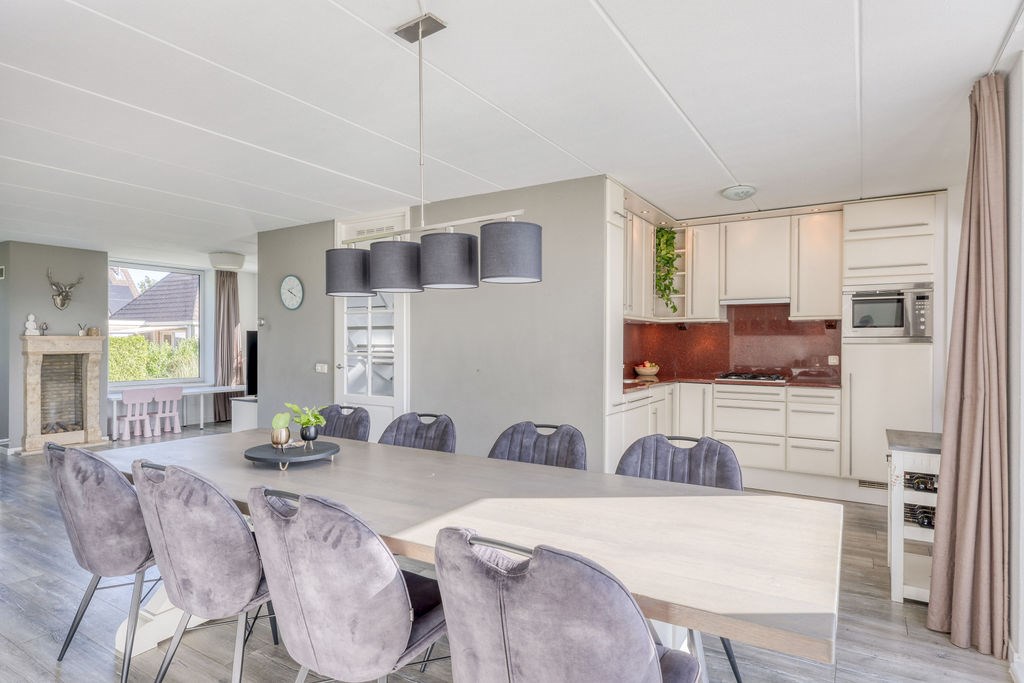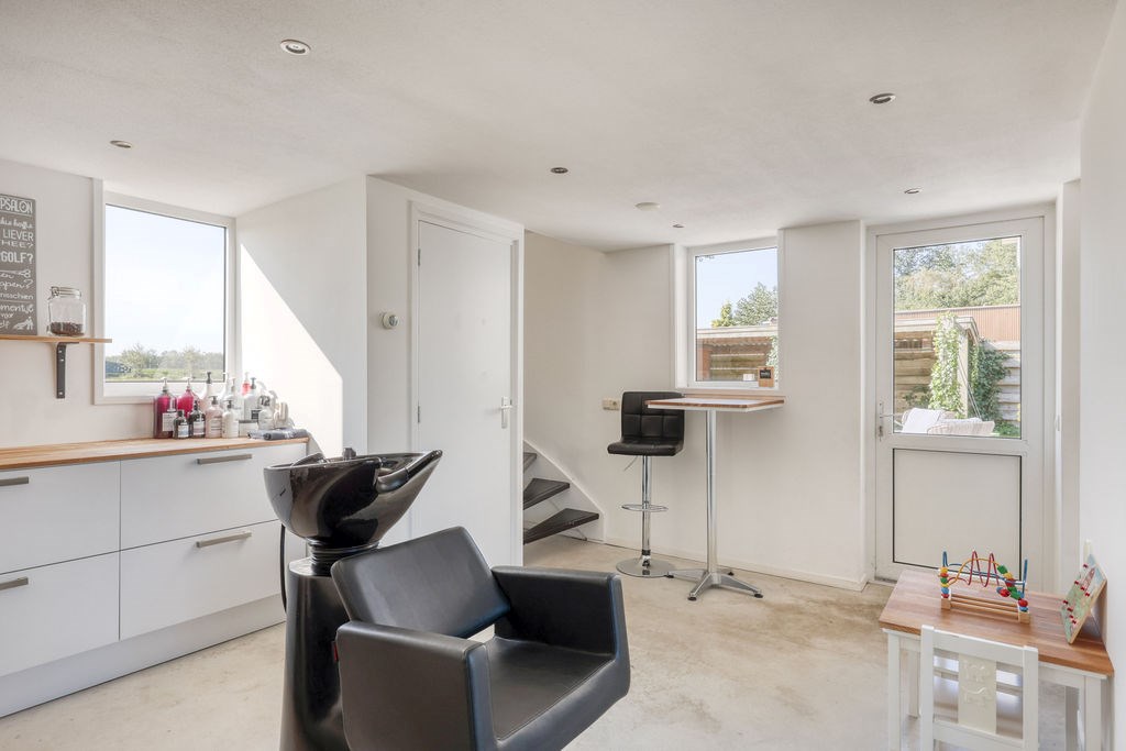 We betreden de woning aan de zijkant en komen in de lichte hal met trapopgang, meterkast en modern toilet met hangcloset en mozaïek tegelvloer, via de hal komen we in de L-vormige woonkamer met fraaie sierschouw en veel leefruimte, de open keuken bevindt zich aan de achterzijde en heeft een hoekkeukenopstelling welke voorzien is van diverse inbouwapparatuur zoals; koelkast, combimagnetron, gaskookplaat, afzuigkap en vaatwasser, via de woonkamer is er d.m.v. een kunststof schuifpui toegang tot de achtertuin op het zuiden. Via de keuken is de aanbouw toegankelijk, hier bevindt zich een kapsalon welke ook een eigen entree heeft. Deze ruimte is voor veel doeleinden geschikt zoals bijv. kantoor, praktijkruimte, hobbyruimte of als extra slaapkamer.