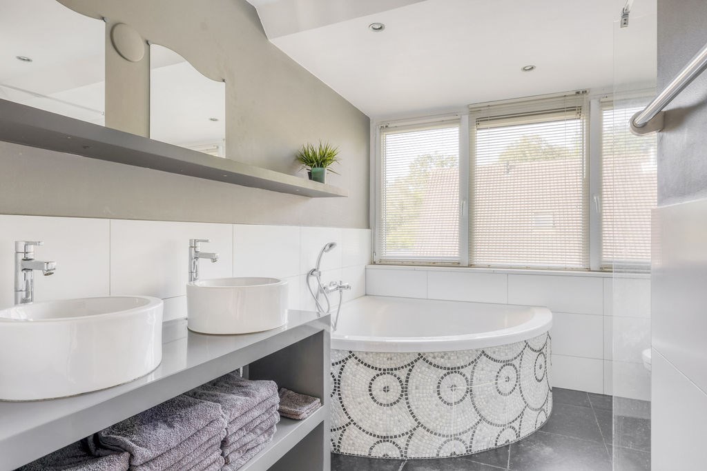 Overloop, welke toegang geeft tot 3 slaapkamers, de master bedroom is voorzien van ruime inbouwkasten en heeft fraai ruim uitzicht, de moderne badkamer is voorzien van een hoekbad, douche, 2e toilet, dubbele opbouw wastafels met meubel en vloerverwarming (elektrisch), cv-ruimte. Boven de kapsalon bevindt zich de wasruimte met aansluitingen voor wasmachine en droger.