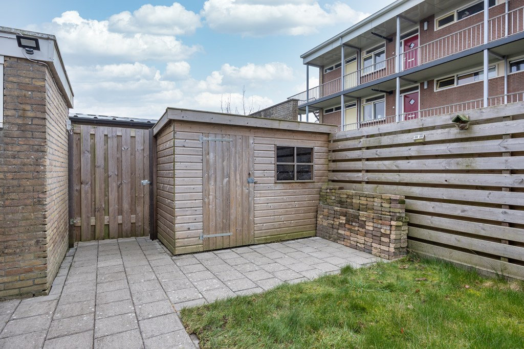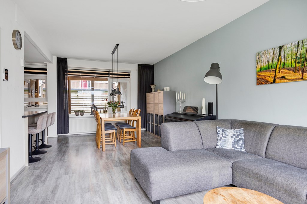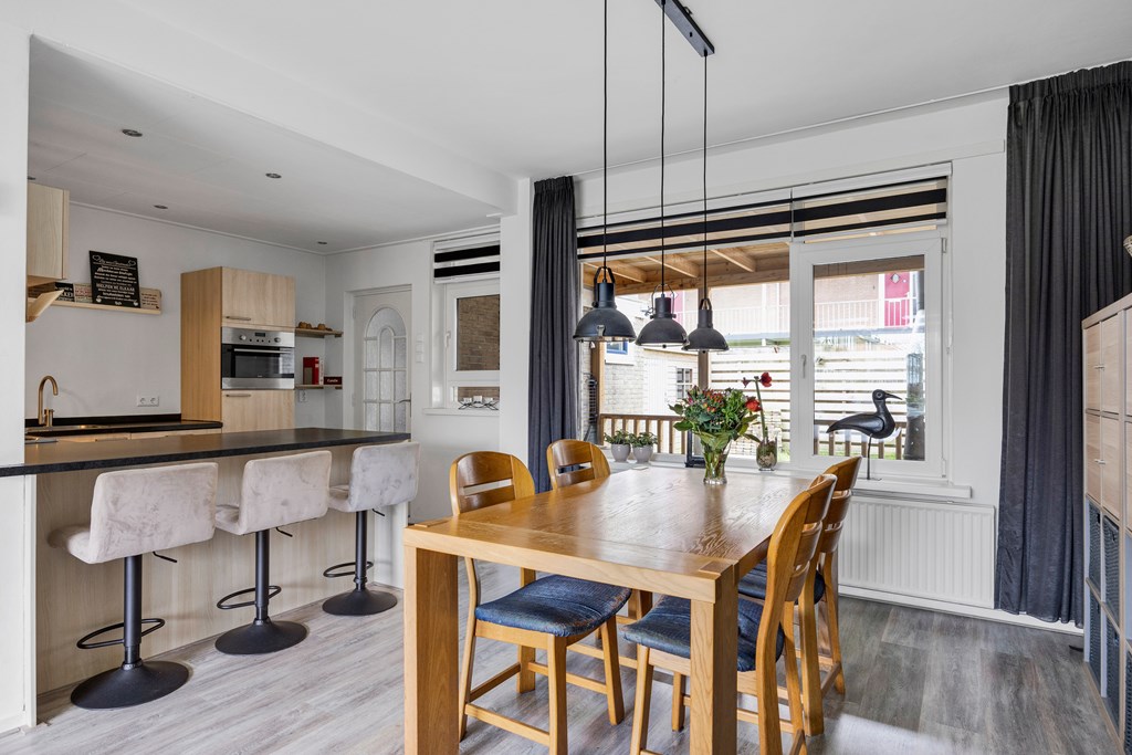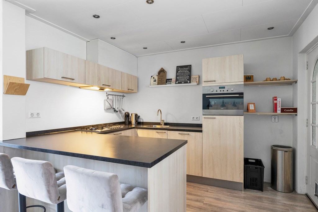 Nadat we de auto geparkeerd hebben op naastgelegen parkeerterrein betreden we de woning via de voordeur en komen we in de hal met toilet, trapopgang en meterkast, rechts bevindt zich de woonkamer met open keuken in U-opstelling met gezellig bargedeelte, de keuken is voorzien van diverse inbouwapparatuur zoals; boiler, koelkast, gaskookplaat, afzuigkap, combimagnetron en vaatwasser. Achter de keuken is de ruime bijkeuken met aansluiting voor de wasmachine en droger en toegang tot de knusse veranda en achtertuin op het zuidwesten.