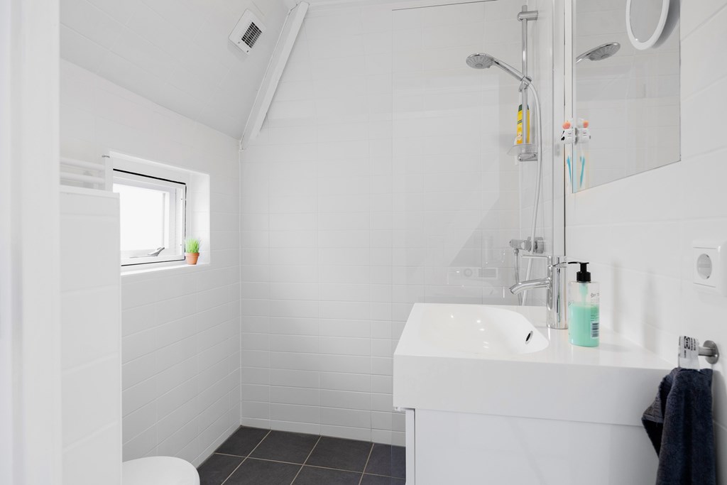 Achter de keuken bevindt zich de trapopgang met daaronder de wasmachine (deze blijft achter), vervolgens lopen we door naar de badkamer met douche, toilet en wastafel met meubel, de badkamer heeft vloerverwarming.