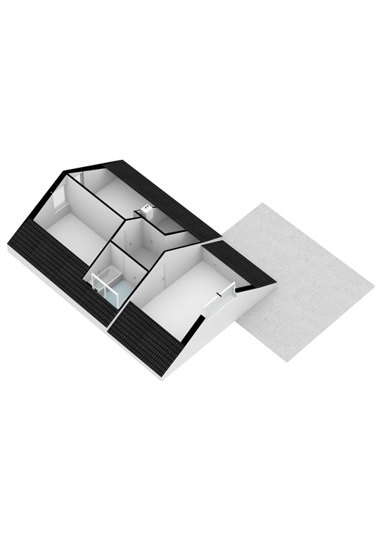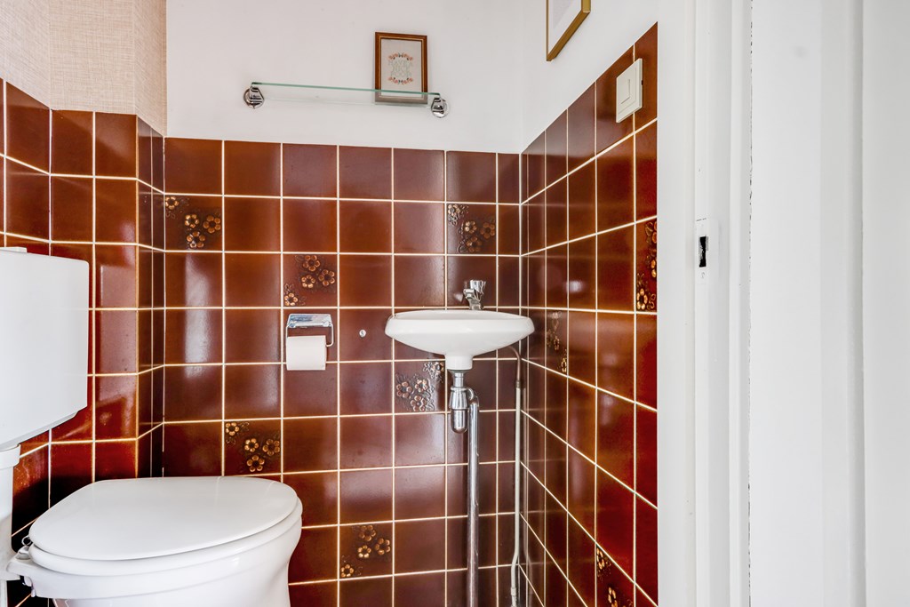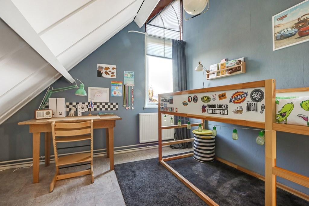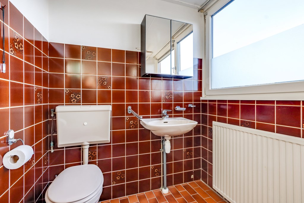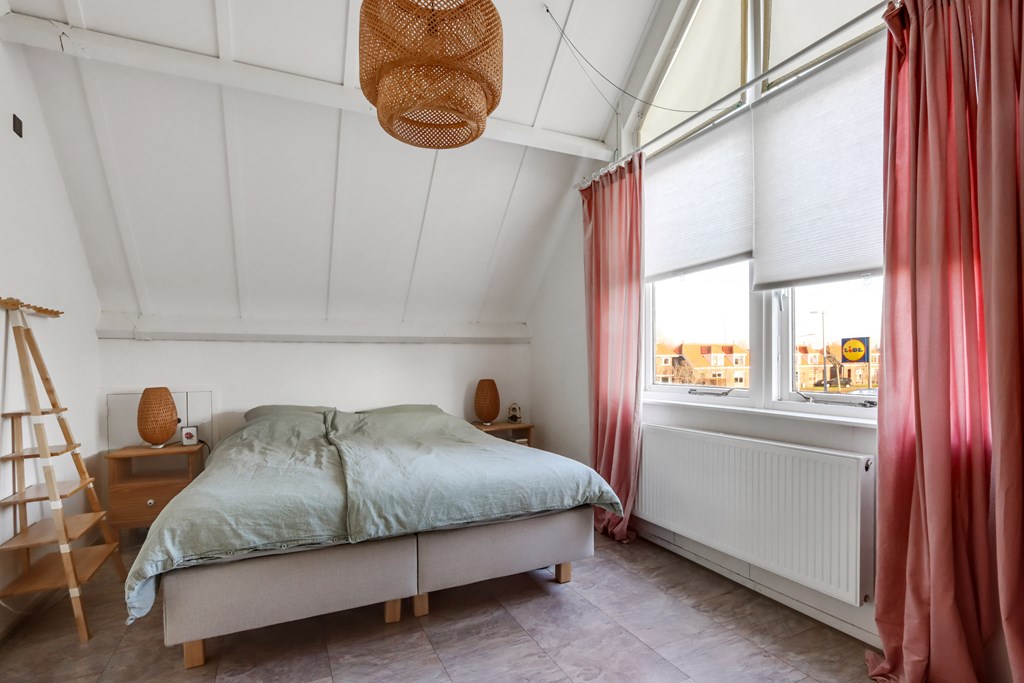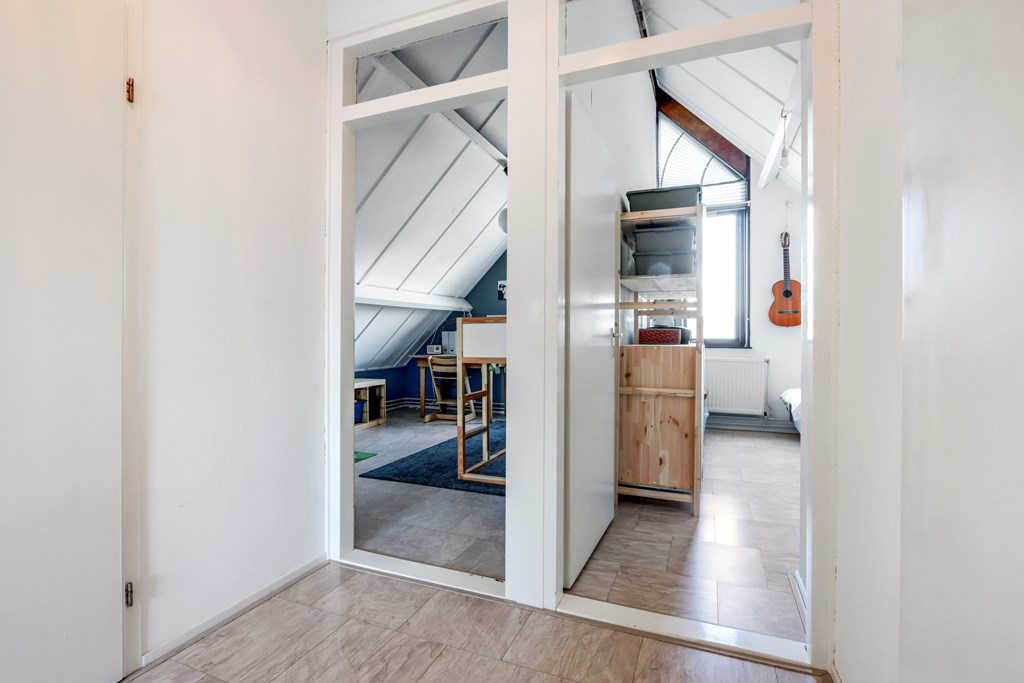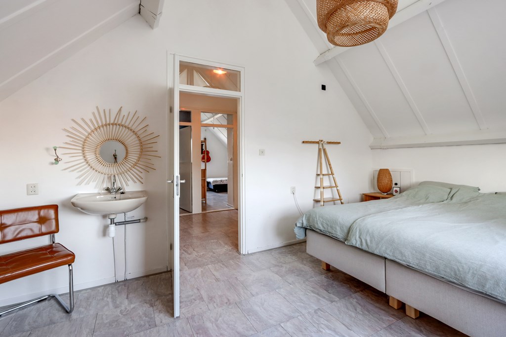 Overloop, gedateerde badkamer met ligbad, 2e toilet en wastafel, 3 slaapkamers, berging met cv-opstelling. De gehele verdieping is tot de nok open, wat een prachtig ruimtelijk effect geeft.