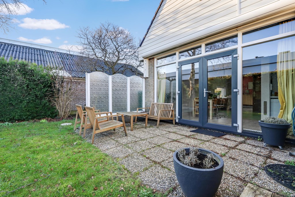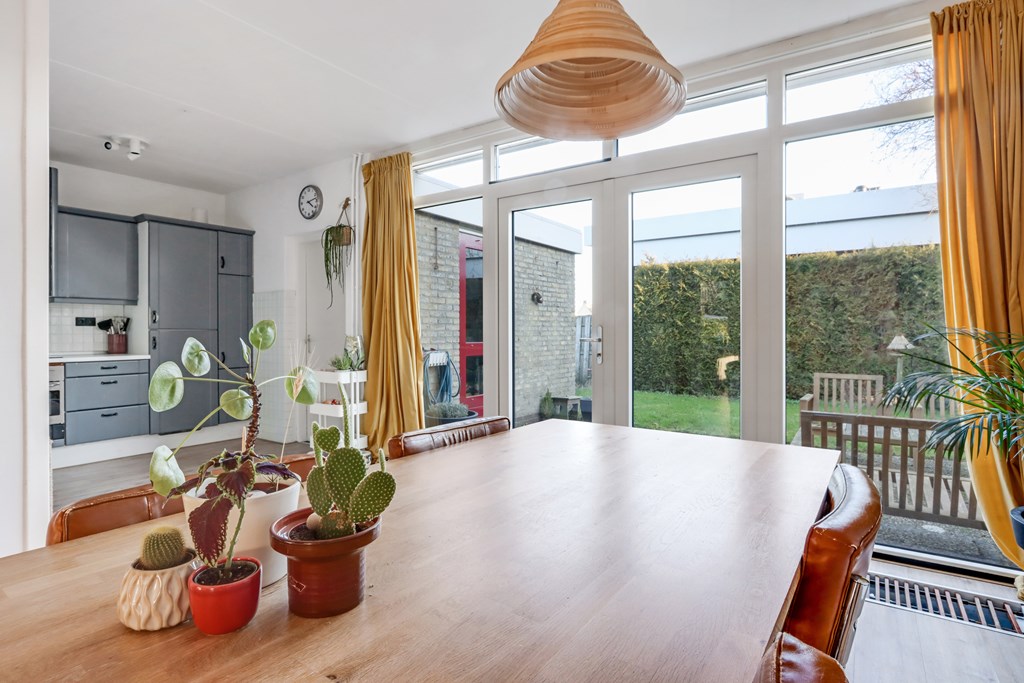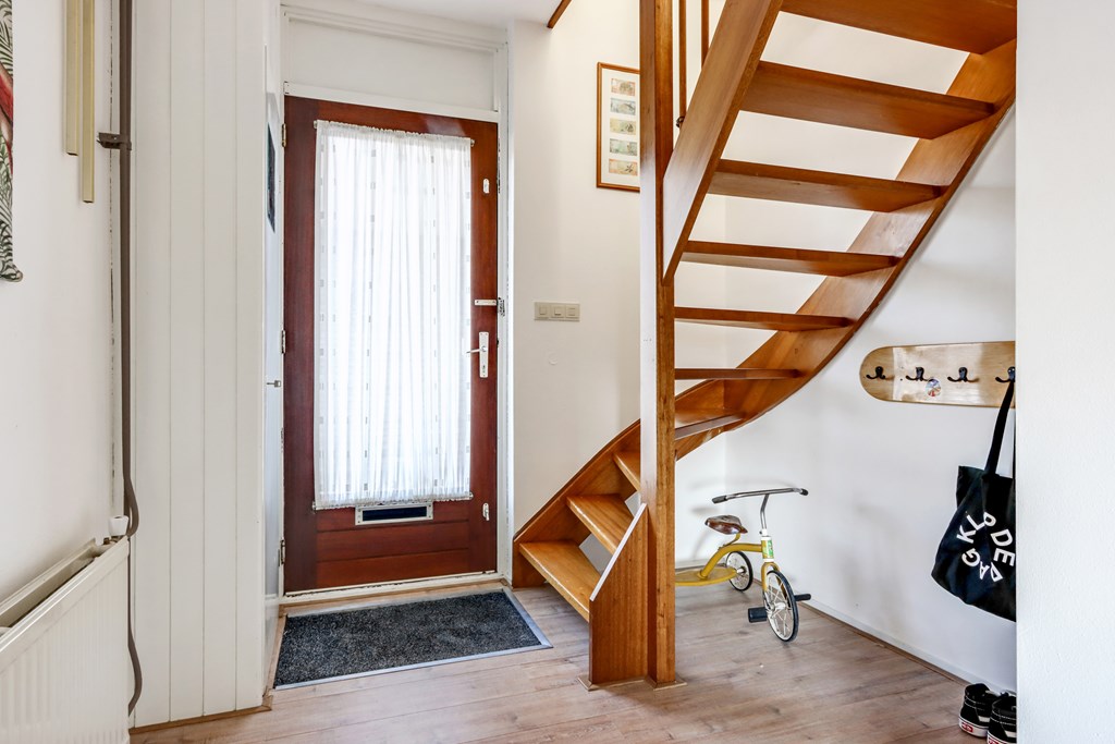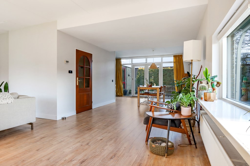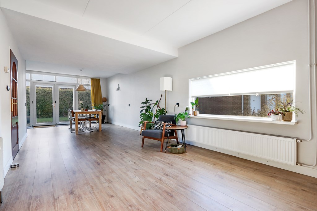We betreden de woning aan de zijkant en komen in de ruime hal met trapopgang, meterkast en toilet. Vanuit de hal is er toegang tot de ruime L-vormige woonkamer met openslaande deuren naar de achtertuin, er is een open keuken met hoekopstelling welke voorzien is van diverse inbouwapparatuur zoals; koelkast, oven (defect), koelkast, vaatwasser, keramische kookplaat en afzuigkap. Achter de keuken is de bijkeuken met aansluiting voor wasmachine en droger, tevens toegang tot de aangebouwde garage van 6.70×3.m. en de achtertuin welke gelegen is op het zuidwesten.