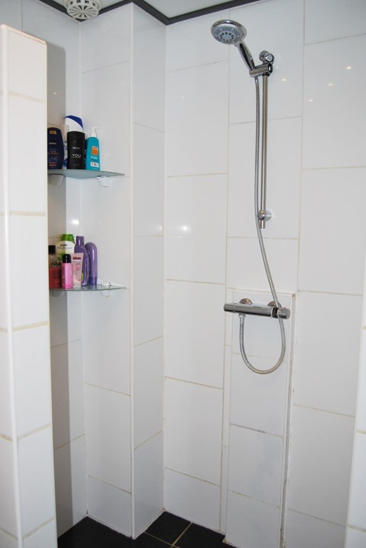 Overloop, 3 slaapkamers, badkamer met douche en wastafel, vaste trap naar 2e verdieping.