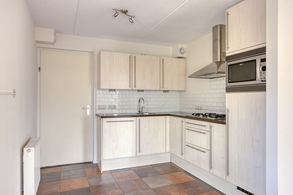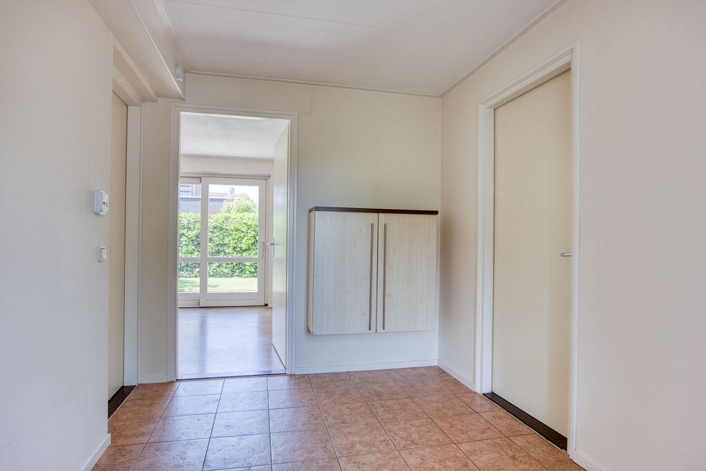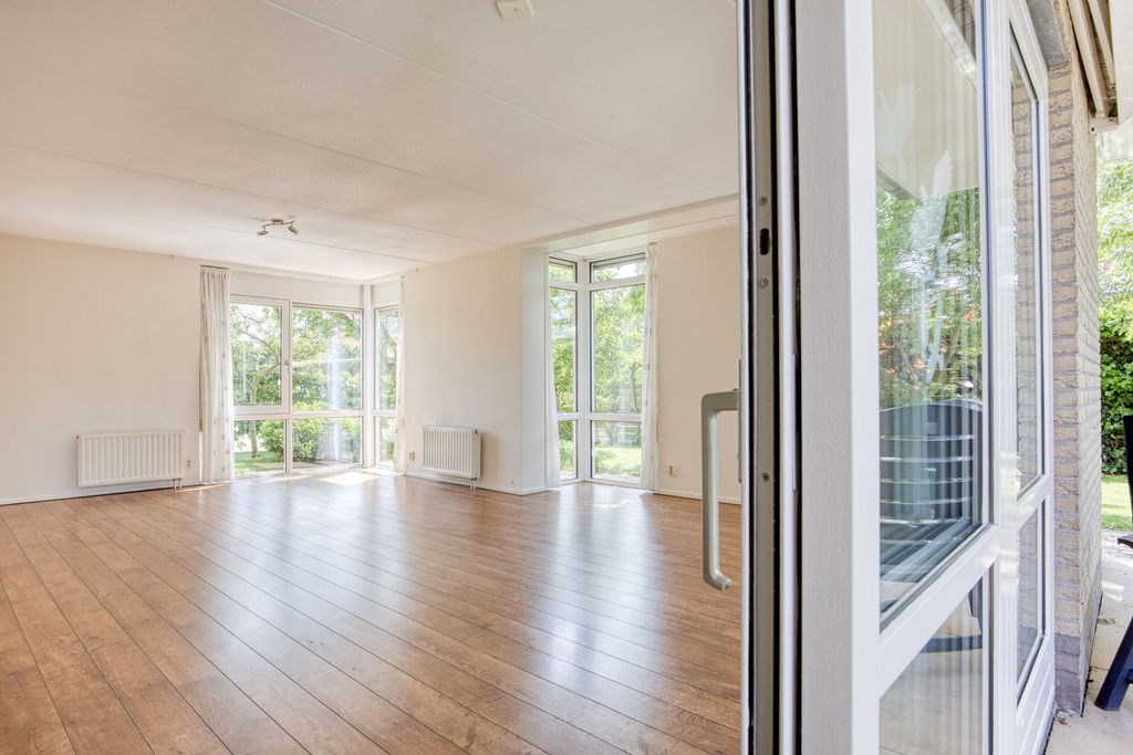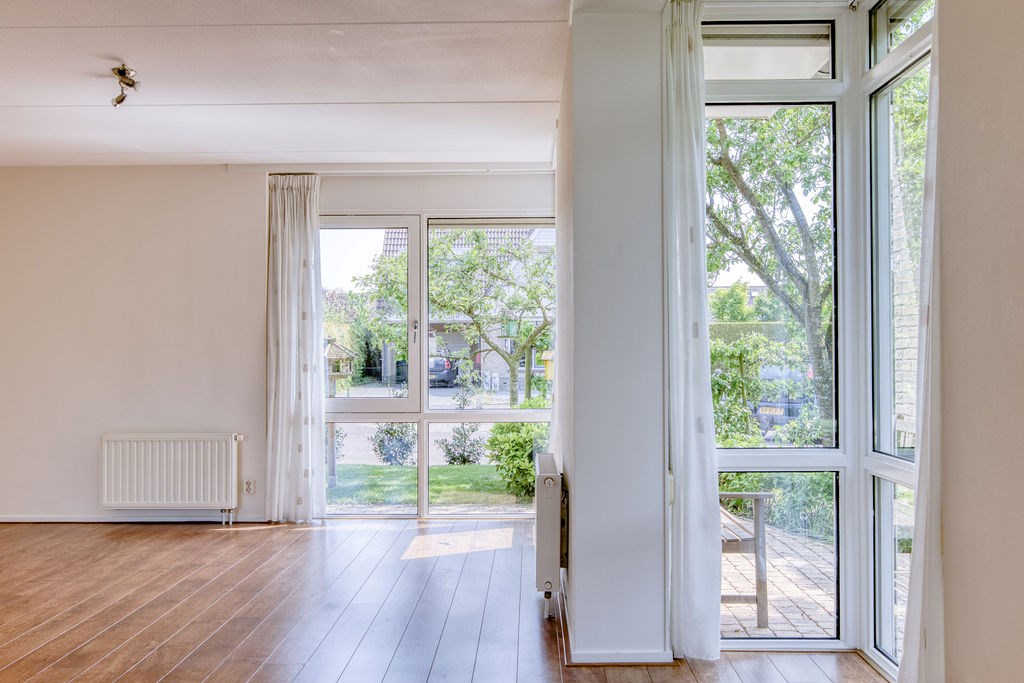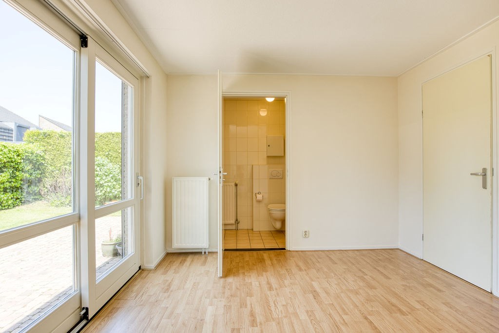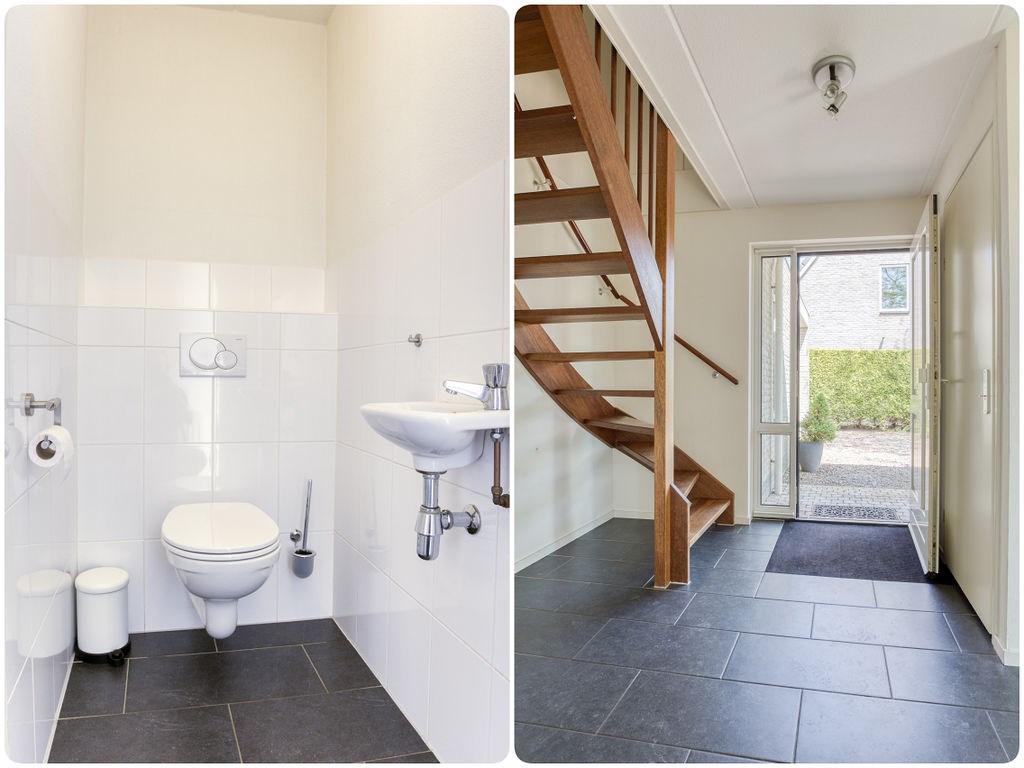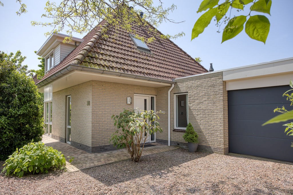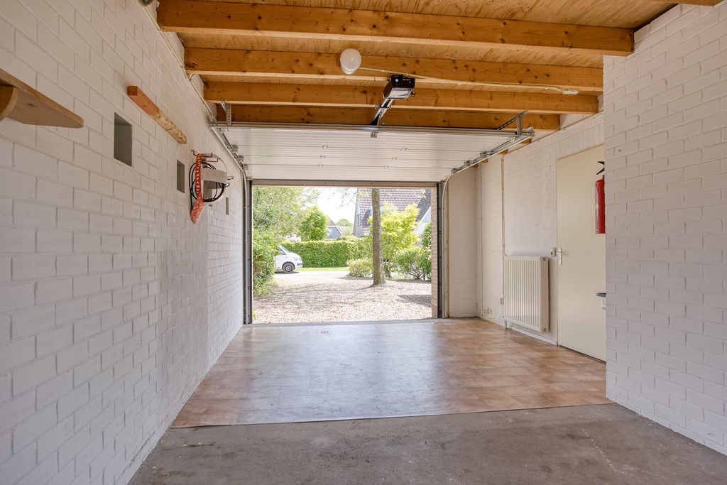We parkeren de auto op het ruime erf omringd met veel groen en betreden de woning via de voordeur aan de zijkant, en komen in de ruime hal met plavuizen vloer, trapopgang, meterkast en toilet. Via de hal komen we in de riante en lichte woonkamer met veel ramen en een schuifpui naar de achtertuin, er is een open keuken met hoekopstelling welke voorzien is van diverse inbouwapparatuur zoals; koelkast, combimagnetron, gaskookplaat, afzuigkap en vaatwasser. Via de keuken komen we in de bijkeuken met aansluiting voor de wasmachine en tevens toegang tot de werkkamer/slaapkamer met eigen badkamer met een douche, 2e toilet en wastafel. Ook is er via de bijkeuken toegang tot de aangebouwde ruime garage met elektrisch bedienbare sectionaaldeur.