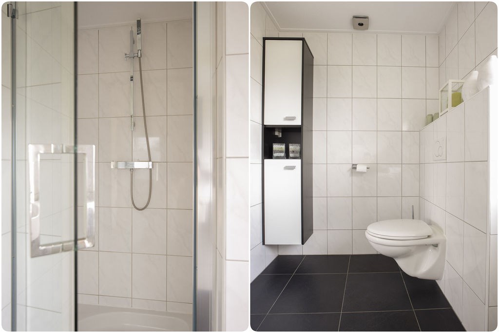 Overloop welke toegang geeft aan 3 slaapkamers en een moderne badkamer met dubbele wastafel, douche, 2e toilet en aansluiting voor wasmachine. Er is een vaste trapopgang naar de 2e verdieping.