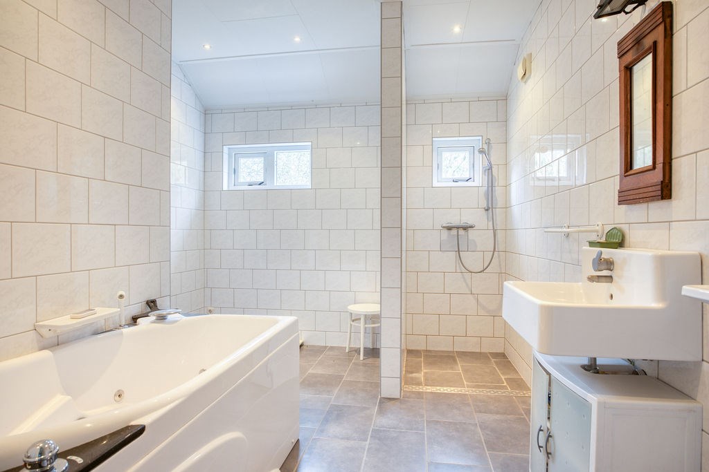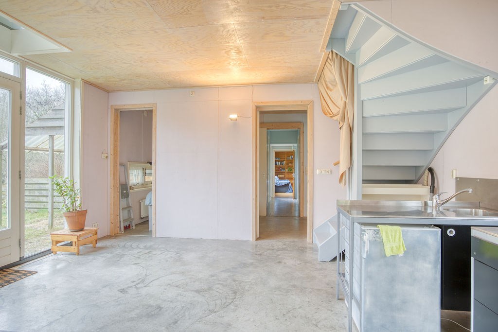 Via de woonkamer in het woonhuis komt u in een gang die leidt naar de houten aanbouw (2007), deze gang is ook via buitenom bereikbaar zodat de aanbouw geheel zelfstandig bewoont/gebruikt kan worden. De gang biedt toegang tot een wasruimte met cv-installatie en aansluiting voor wasmachine, rechts van de gang is de badkamer met whirlpool bad, douche en wastafel, een ruime kelder met stahoogte en een toilet. Aan het einde van de gang is een tussenkamer, thans in gebruik als slaapkamer met aansluitend de woonkamer/tuinkamer met openslaande deuren naar de achtertuin, er is nog een keukenblok en trap naar de verdieping. De begane grond van de aanbouw is voorzien van vloerverwarming.