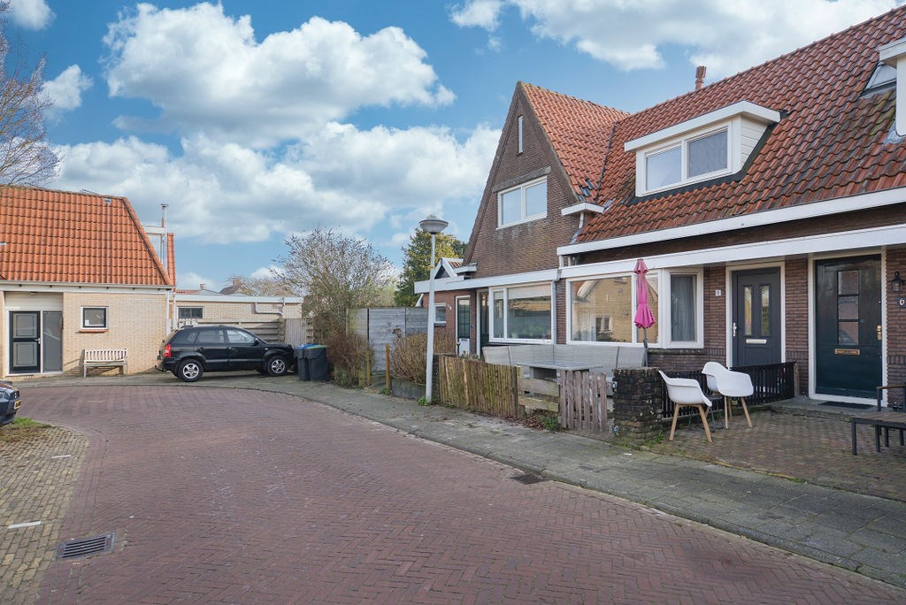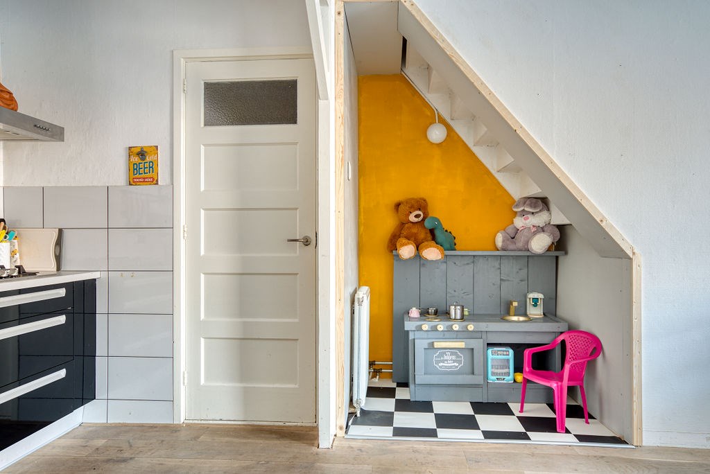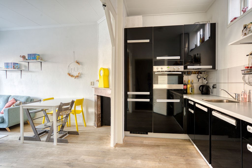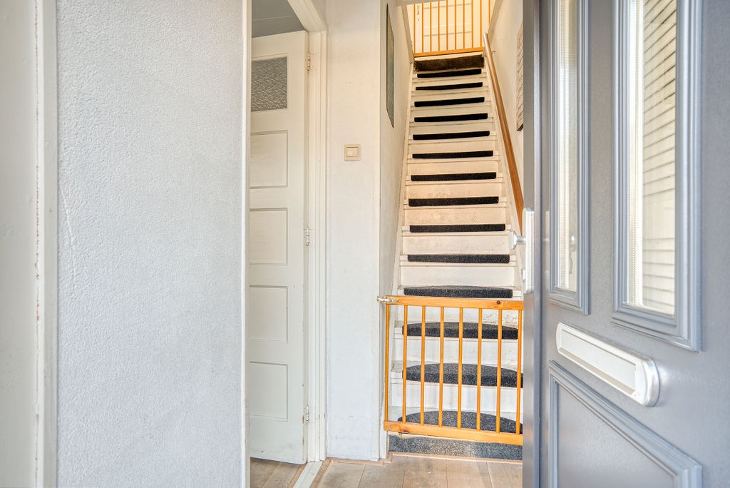 We betreden de woning aan de voorzijde en komen in de hal met trapopgang, links van de hal bevindt zich de knusse woonkamer met authentieke schouw en nis onder de trap, er is een open keuken met moderne hoekopstelling welke voorzien is inbouwapparatuur zoals; koelkast, vrieskast, combimagnetron, gaskookplaat, afzuigkap en vaatwasser, naast de keuken is een kleine hal welke toegang geeft tot het moderne toilet met hangcloset.
