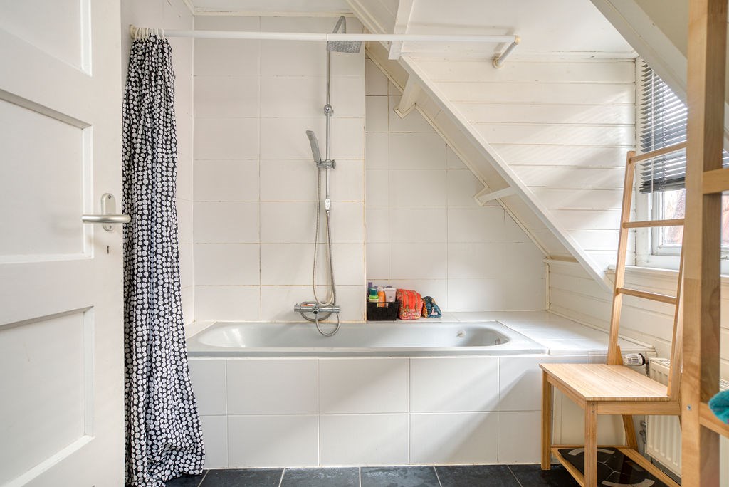Overloop met inbouwkasten waar zich de wasmachine en droger in bevindt, er is een ruime slaapkamer met inbouwkast en een badkamer met ligbad en wastafel.