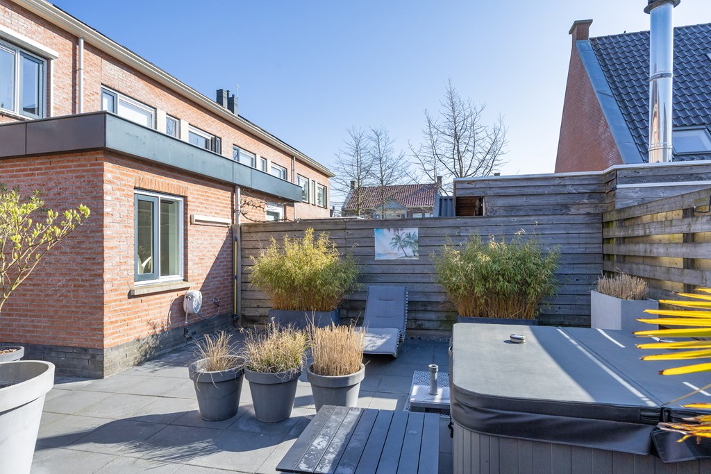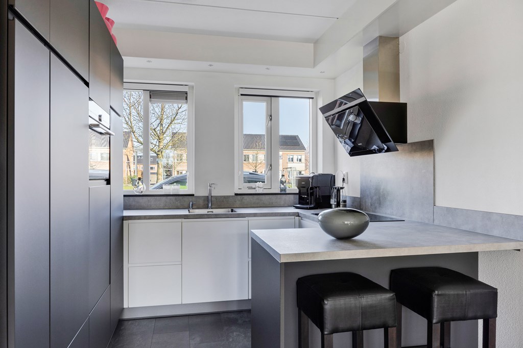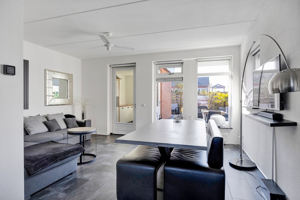 Nadat we de auto geparkeerd hebben op het parkeerterrein achter de woning, welke bereikbaar is via de fraaie poort, betreden we de woning via de voordeur en komen in de hal met toilet, meterkast, trapopgang en vaste kast. Rechts van de hal bevindt zich de L-vormige woonkamer met open keuken, de keuken bevindt zich aan de voorzijde en is modern, van alle gemakken voorzien en heeft een gezellige bar, de keuken in U-vorm is voorzien van diverse inbouwapparatuur zoals koelkast, vrieskast, inductiekookplaat, afzuigkap, vaatwasser en combimagnetron. Aansluitend aan de woonkamer is de bijkeuken (2015), hier is een aansluiting voor de wasmachine en droger, deze kunnen overigens ook op de zolder geplaatst worden aangezien hier de aansluitingen ook aanwezig zijn. Via de bijkeuken stap je zo de heerlijk zonnige tuin in gelegen op het zuiden en fraai aangelegd, tevens is er een achterom.