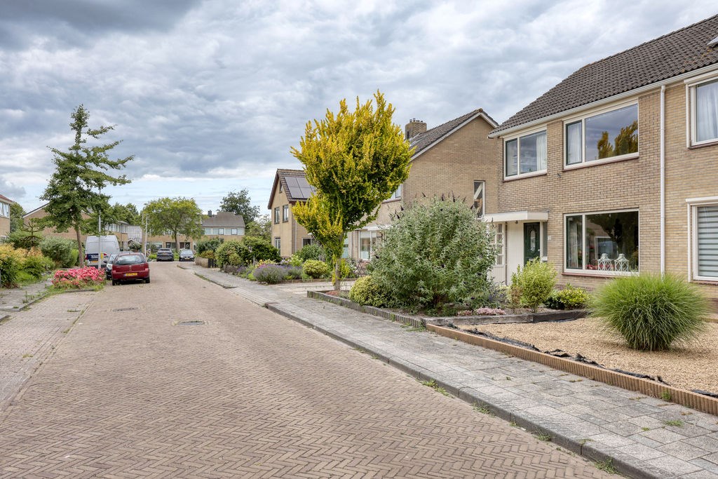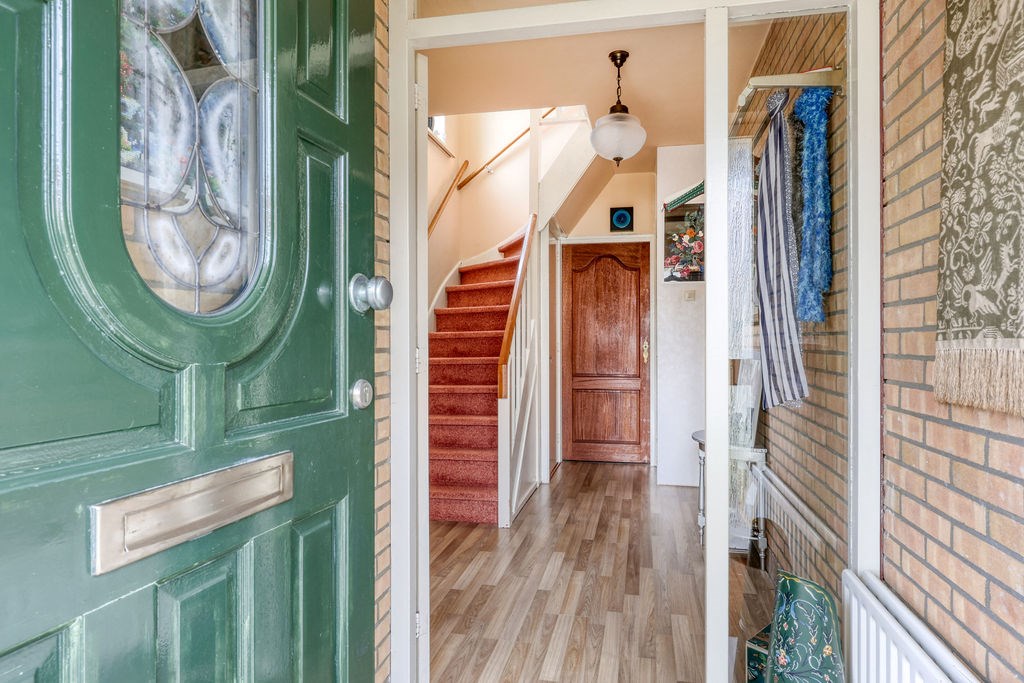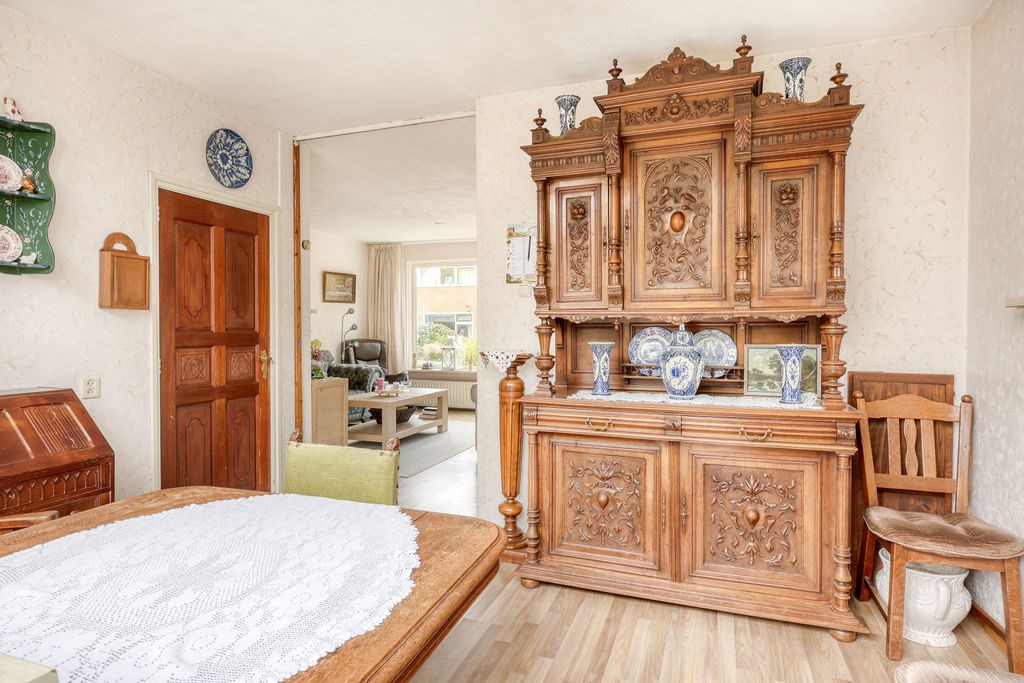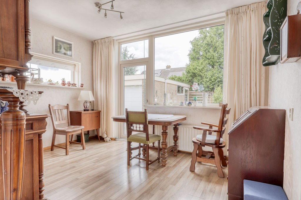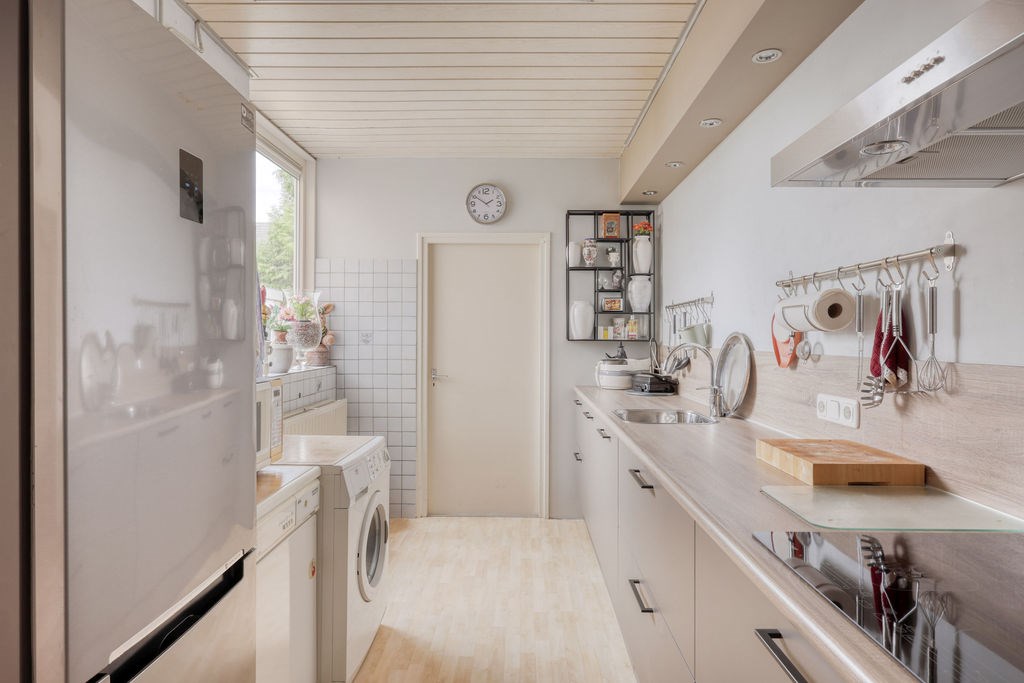 Nadat we de auto op eigen erf geparkeerd hebben betreden we de woning aan de voorzijde en komen in het voorportaal van de hal, met daarachter de ruime hal met trapopgang, kelder, meterkast en toilet, vanuit de hal is zowel de woonkamer als de eetkamer/achterkamer toegankelijk. De woonkamer en eetkamer kunnen gescheiden worden door een schuifdeur. Via de achterkamer is de keuken bereikbaar, de moderne rechte keukenopstelling is slechts 2 jaar oud en voorzien van diverse inbouwapparatuur zoals; Inductie kookplaat, afzuigkap en vaatwasser. Achter de keuken is nog een bijkeuken met toegang tot de achtertuin.