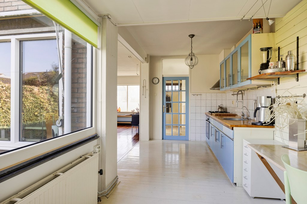 Nadat we de auto op het erf hebben geparkeerd betreden we de woning via de voordeur en komen in de hal met meterkast, toilet en trapopgang, vervolgens komen we in de ruime open keuken met rechte keukenopstelling met oven, gaskookplaat en afzuigkap, aansluitend is de woonkamer, deze is heerlijk licht door de grote raampartijen aan de voor- en achterkant. Achter de keuken bevindt zich de bijkeuken, hier is tevens de aansluiting voor de wasmachine en toegang tot de achtertuin en de aangebouwde garage van ca. 6×3 m.