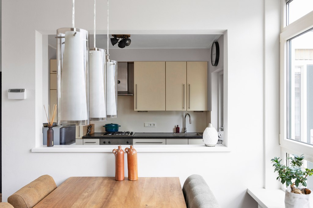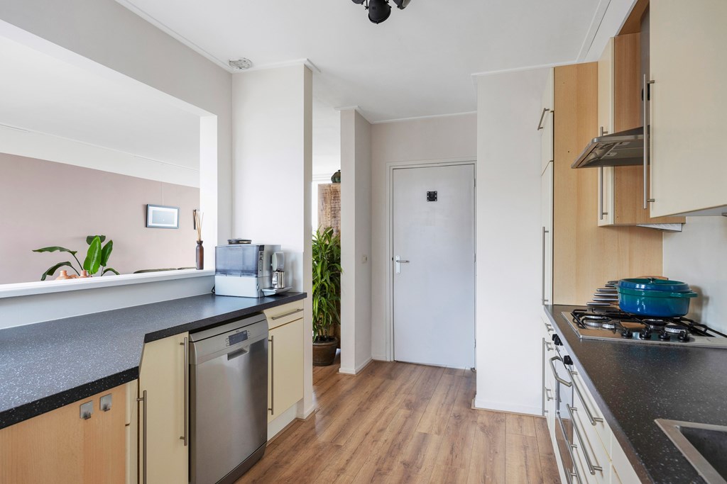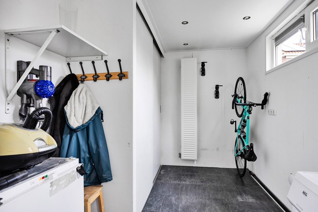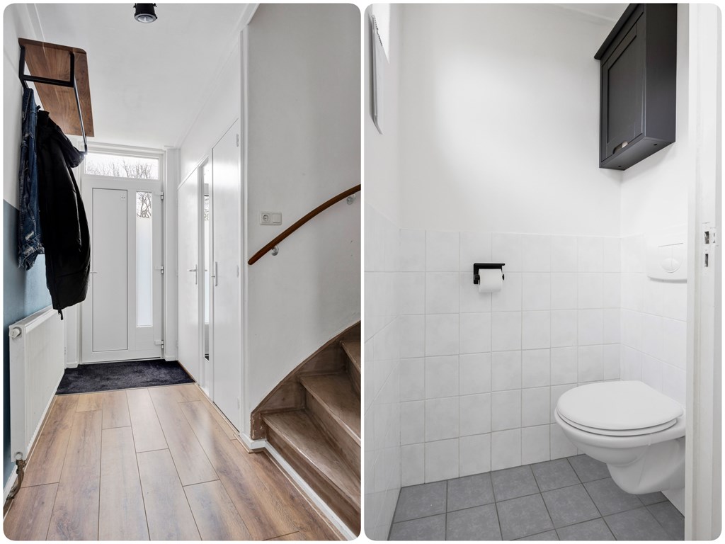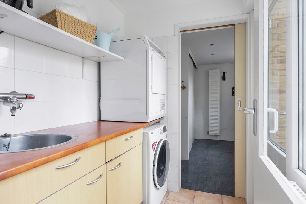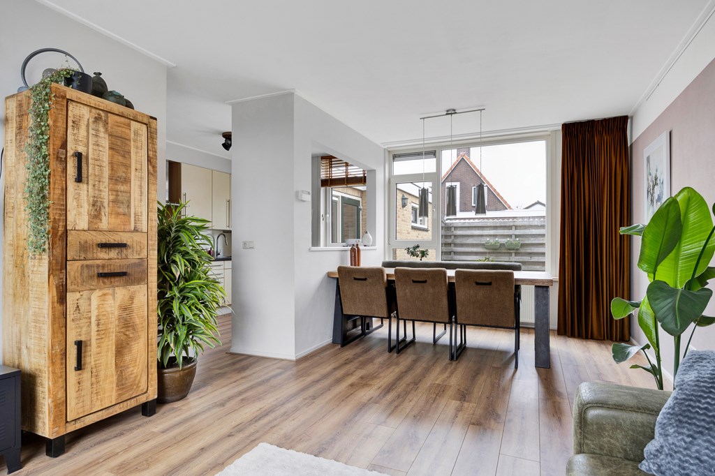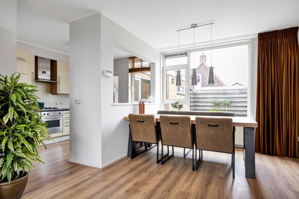 Nadat we de auto in de straat hebben geparkeerd betreden we de woning via de voordeur en komen in de hal met toilet, inbouwkast, meterkast en trapopgang, lopen we door dan komen we in de ruime open keuken met parallel keukenopstelling welke voorzien is van diverse inbouwapparatuur zoals een nieuwe koel-vriescombinatie, gaskookplaat, afzuigkap, oven en vaatwasser, de open nis naar de woonkamer maakt dat de ruimtes sfeervol, ruimtelijk en licht zijn. De woonkamer is heerlijk licht door de grote raampartij aan de voor- en achterzijde. Achter de keuken bevindt zich de geïsoleerde bijkeuken met een klein aanrechtblokje en aansluiting voor de wasmachine en droger, tevens achterdeur naar de achtertuin, aansluitend is een berging met schuifdeurkasten.
