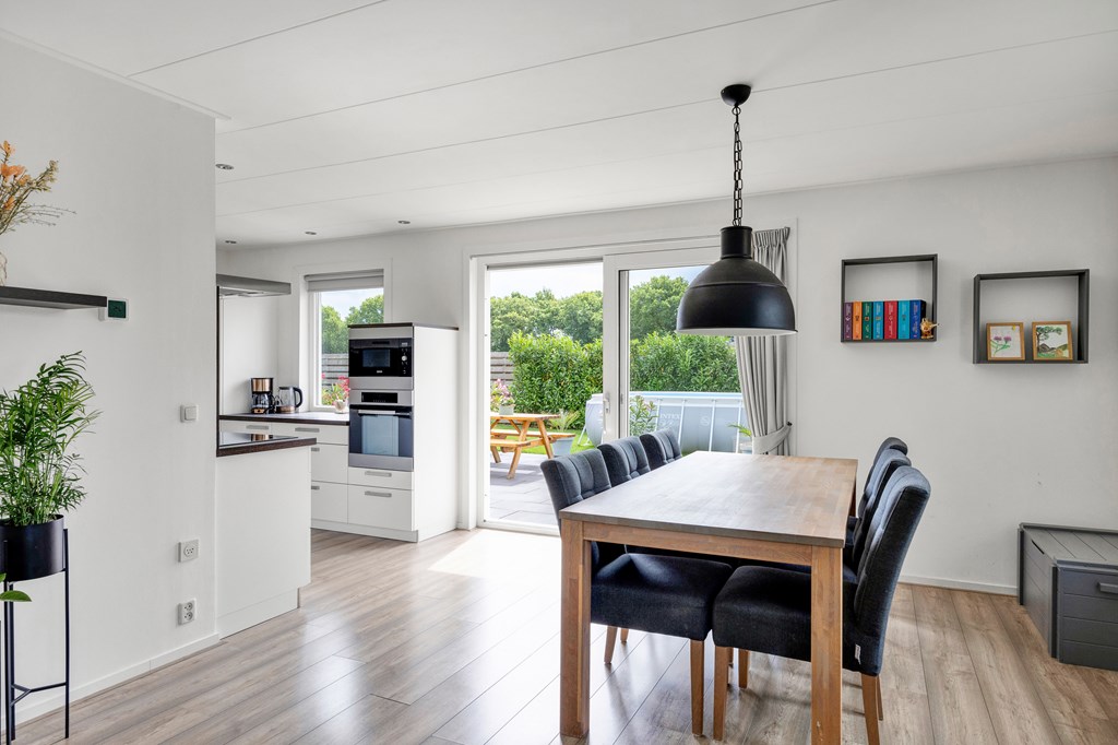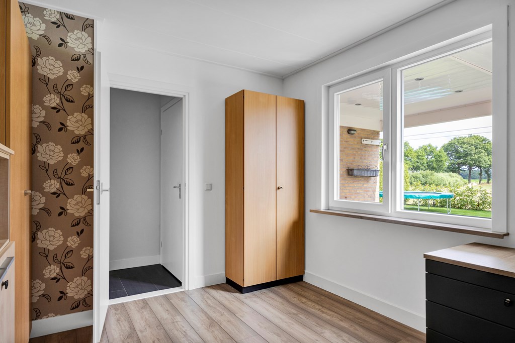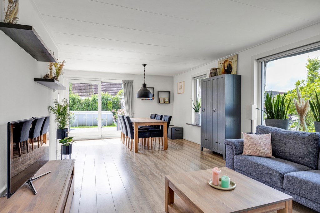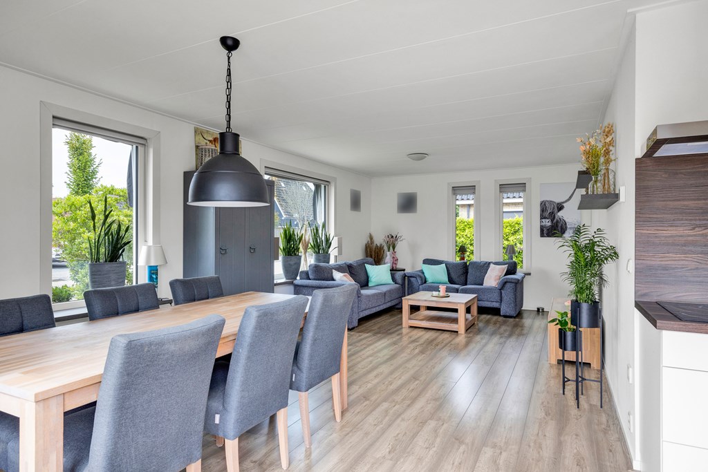 Rechts van de hal komen we in de woonkamer met schuifpui aan de achterzijde, de grote glazen pui zorgt voor veel natuurlijke lichtinval en ook hier heb je dat prachtige vrije landelijke uitzicht.