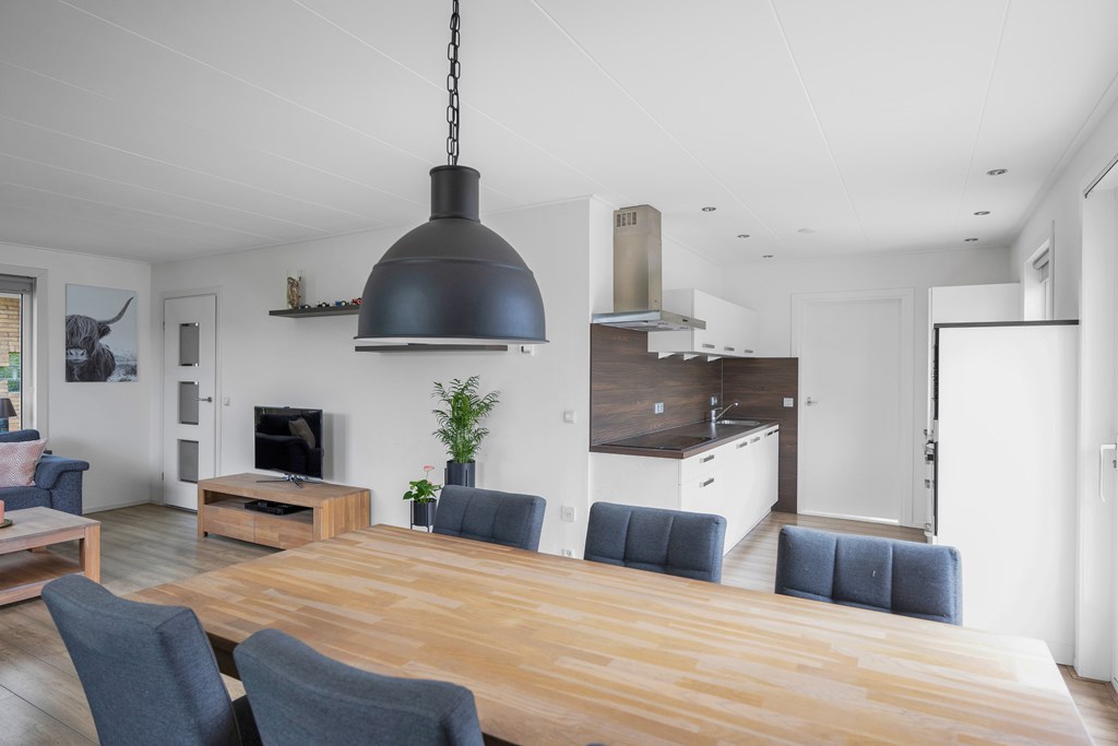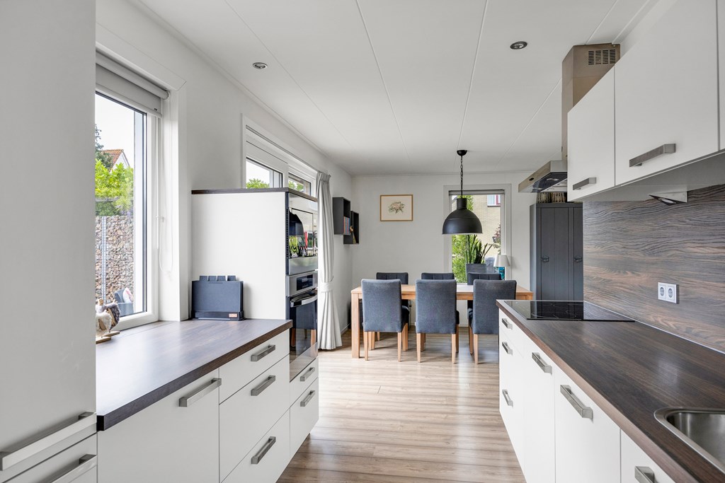 De open keuken is voorzien van een parallel keukenopstelling welke voorzien is van diverse inbouwapparatuur zoals; koelkast, vrieskast, inductiekookplaat, afzuigkap, vaatwasser, oven en magnetron. Achter de keuken bevindt zich de bijkeuken met aansluiting voor de wasmachine en droger, tevens de technische installaties en een grote schuifdeurkast.