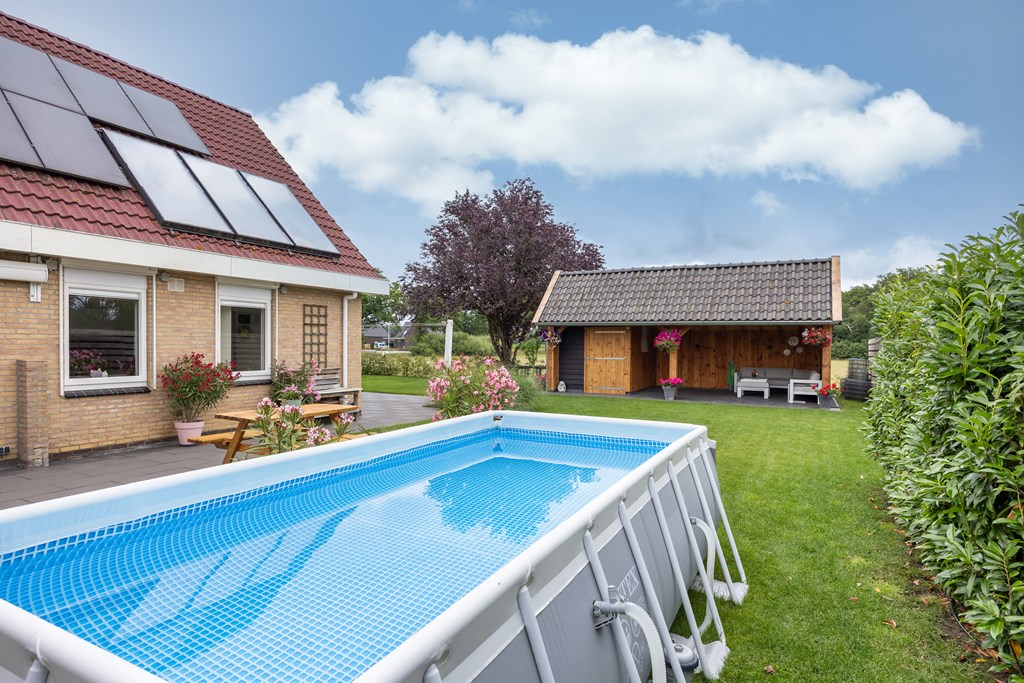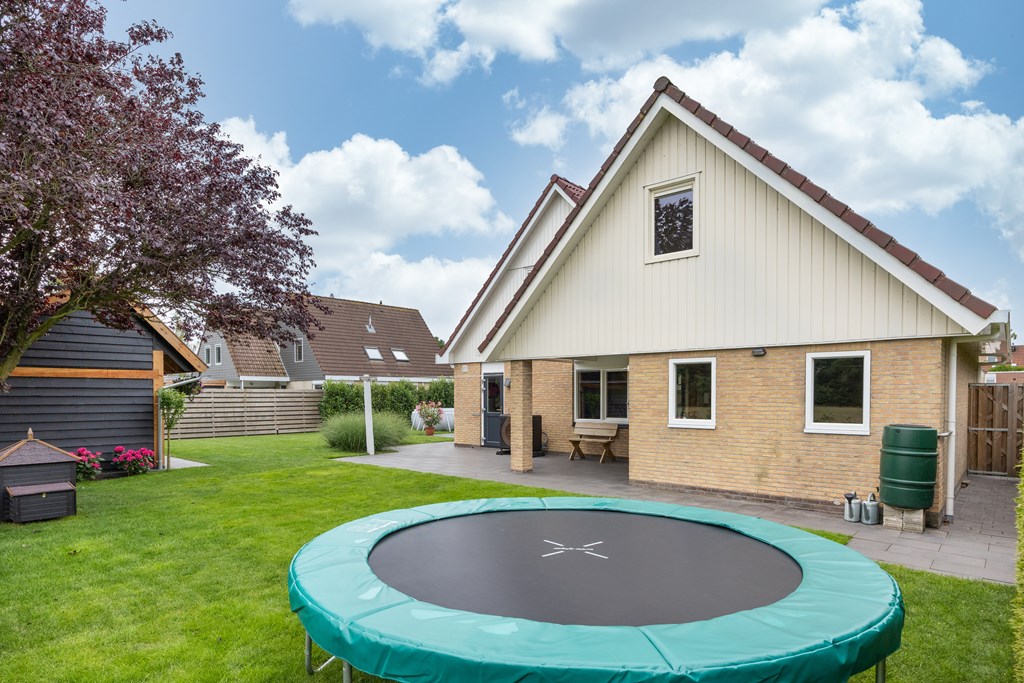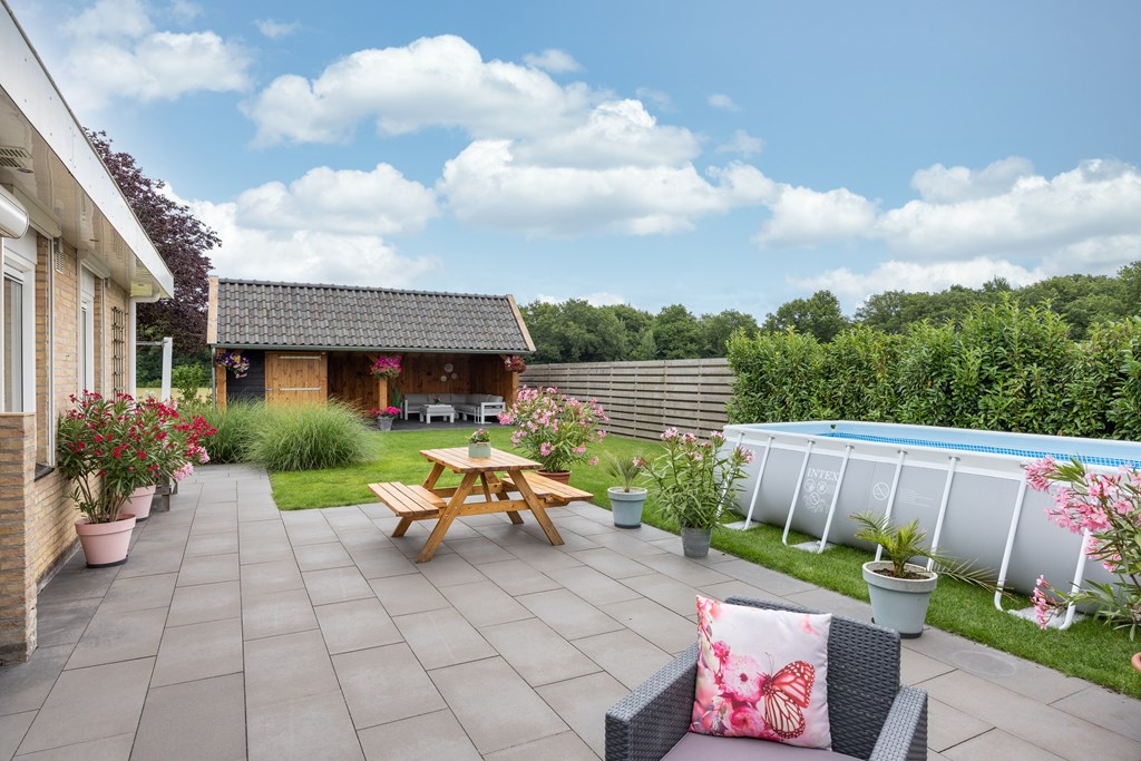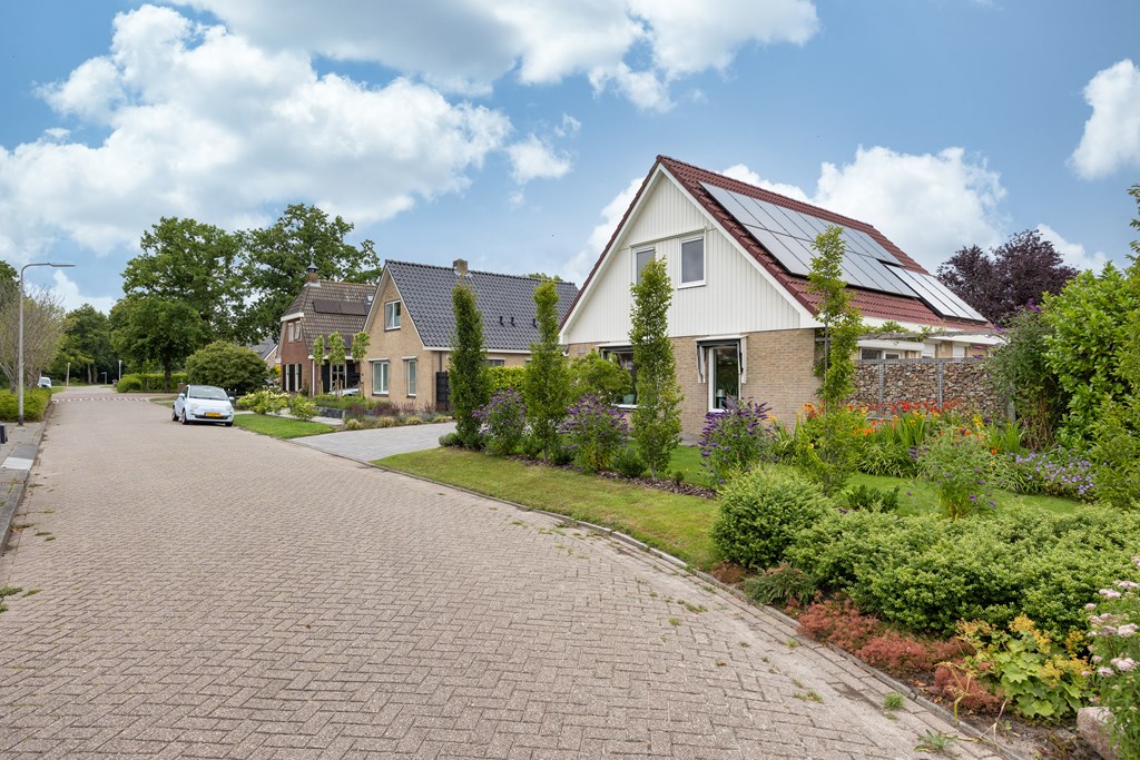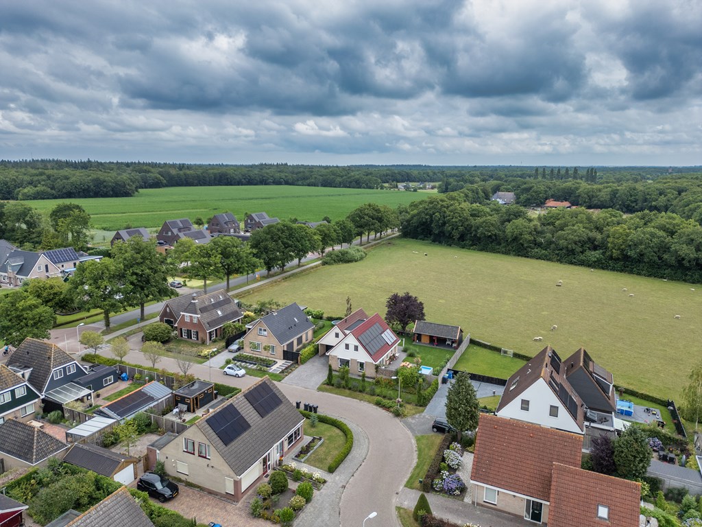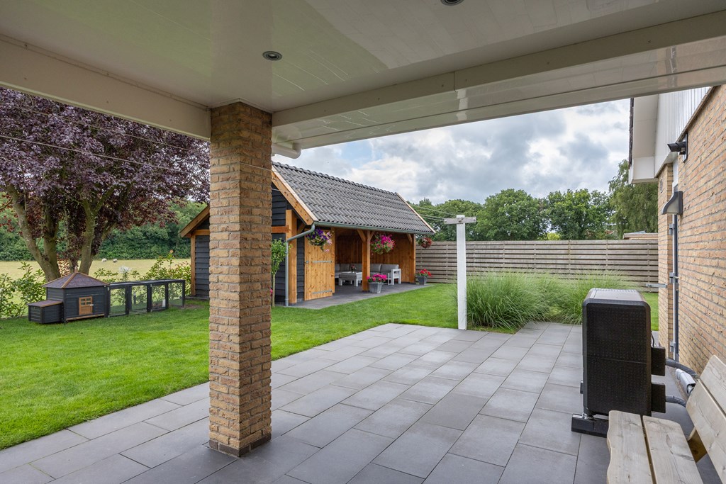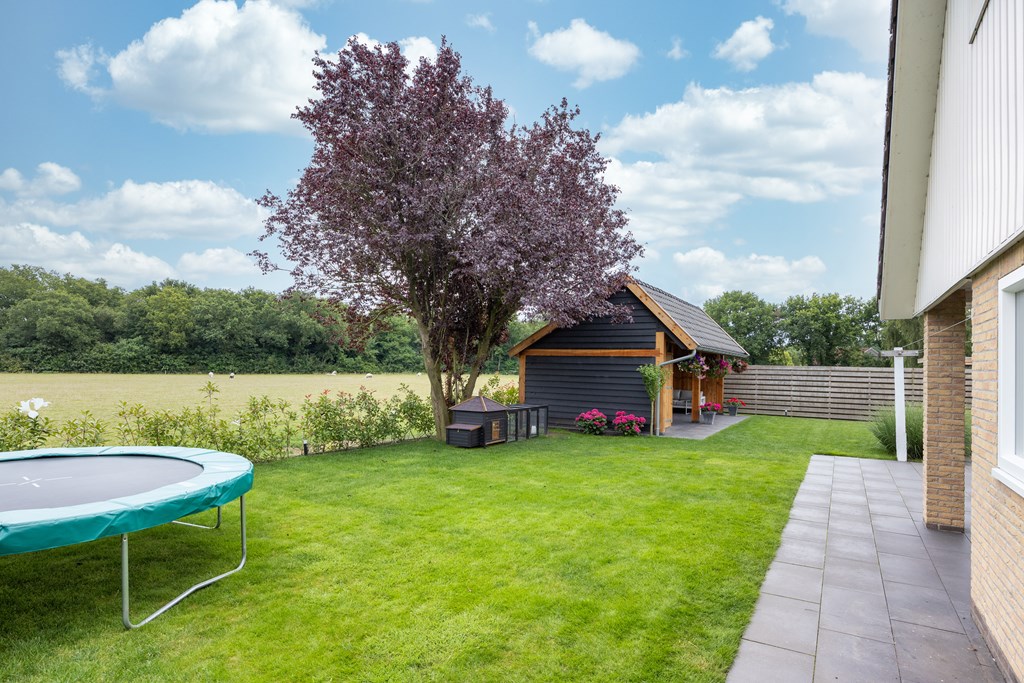 De achter- en zijtuin zijn gelegen op het zuid/zuidwesten en er is in 2021 een nieuwe kapschuur met veranda gebouwd, een heerlijke plek om tot rust te komen. Door de locatie van de woning, gelegen aan een weide, zie je regelmatig schapen langslopen, vogels/roofvogels langs vliegen en laten we de hazen en reeën niet vergeten, je wordt telkens weer verrast.