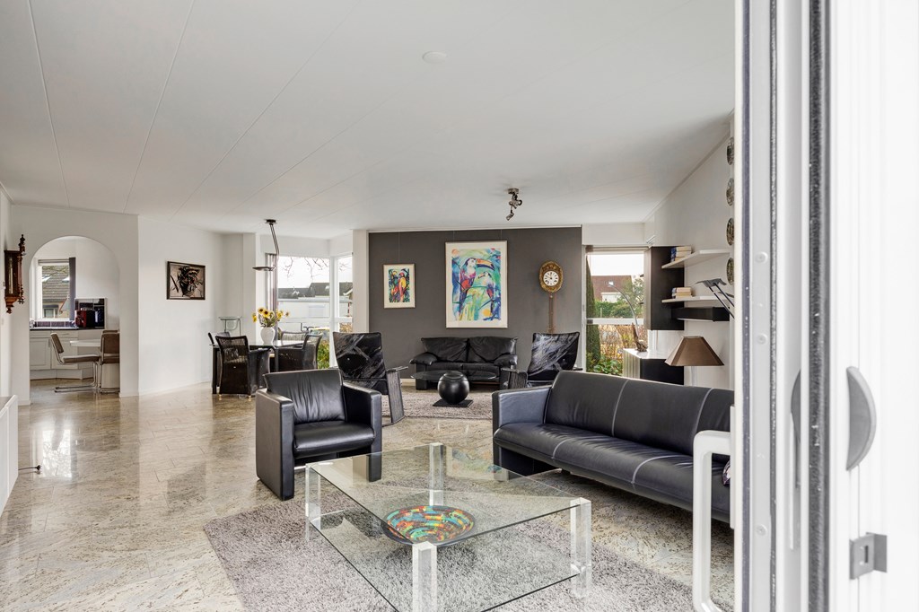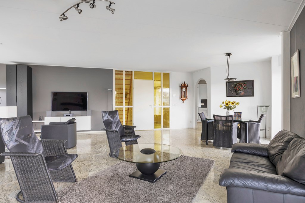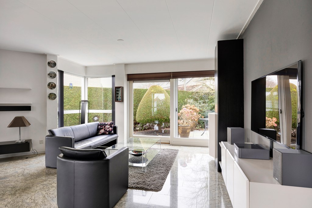 We betreden de woning via de voordeur en komen in het portaal/de vestibule met meterkast en een glazen pui met klapdeur die naar de centrale hal leidt, de hal geeft toegang tot alle ruimtes op de begane grond zoals het toilet, de trapopgang naar de verdieping, de riante woonkamer welke toegankelijk is via een glazen pui, de woonkamer heeft meerdere zitgedeeltes en is speels ingericht en geeft veel mogelijkheden qua inrichting, er is tevens een grote schuifpui die leidt naar de fraaie tuin rondom, gelegen op het zuiden/zuidwesten. De keuken is via een doorgang bereikbaar, hier bevindt zich een hoekkeuken met inbouwapparatuur zoals een koelkast, vrieskast, keramische kookplaat en afzuigkap, hier kun je gemakkelijk een eettafel met stoelen kwijt om bijvoorbeeld lekker aan te ontbijten, de keuken heeft ook nog 2 grote inbouwkasten/voorraadkasten. Terug in de hal lopen we naar de 2 slaapkamers op de begane grond, 1 slaapkamer heeft een grote schuifpui naar de tuin. Ook de badkamer bevindt zich op de begane grond, voorzien van een ligbad, douche, 2e toilet en wastafel met meubel. Via de hal is ook de aangebouwde ruime garage bereikbaar, hier bevindt zich tevens de aansluiting voor de wasmachine en droger en de cv-installatie, er is ook toegang tot de achtertuin.