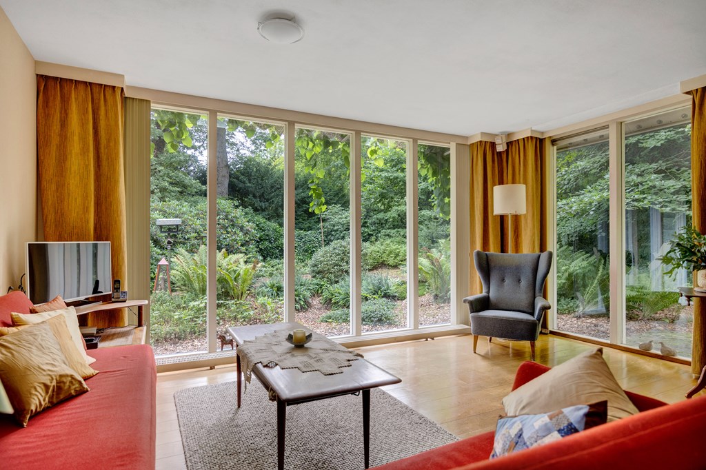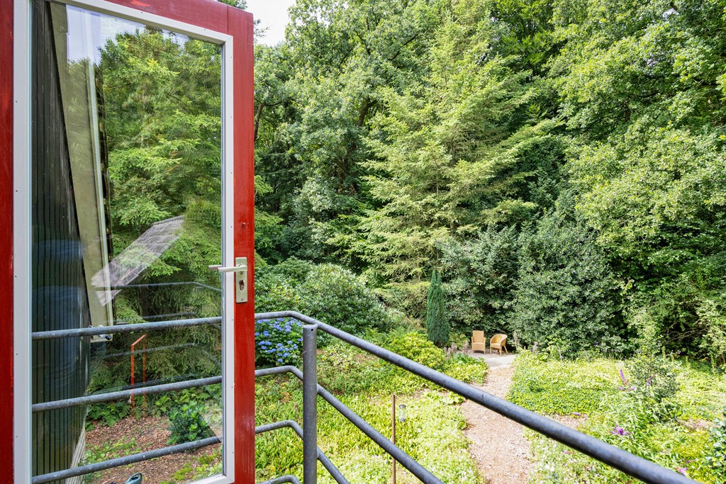 Nadat we de auto geparkeerd hebben op eigen erf en eerst eens even rustig om ons heen hebben gekeken om te genieten van het omringende bos, de weelderige tuin en de rust die op ons neerdaalt, kunnen we dan de woning betreden via de voordeur. We komen in de hal met trapopgang en meterkast, rechts van de hal bevindt zich de doucheruimte met toilet, links van de hal is een kleine slaapkamer/kantoor en rechtdoor komen we in de ruime woonkamer. Hier heb je door de grote raampartij onbeperkt zicht op de tuin met het omringende bos, dit uitzicht verveelt nooit, op en top genieten van elk seizoen.