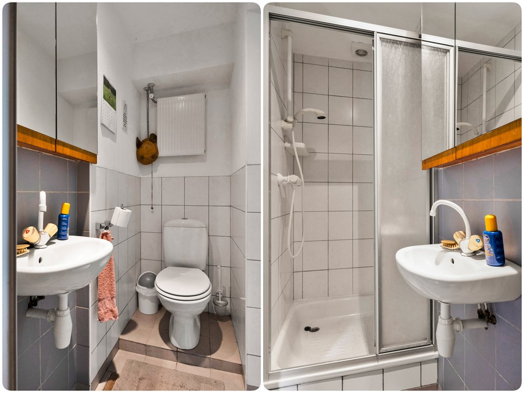 De overloop geeft toegang tot een inbouwkast, badkamer met douche, wastafel en 2e toilet, en 2 ruime slaapkamers elk met inbouwkasten. De achterste slaapkamer heeft openslaande deuren naar het balkon.