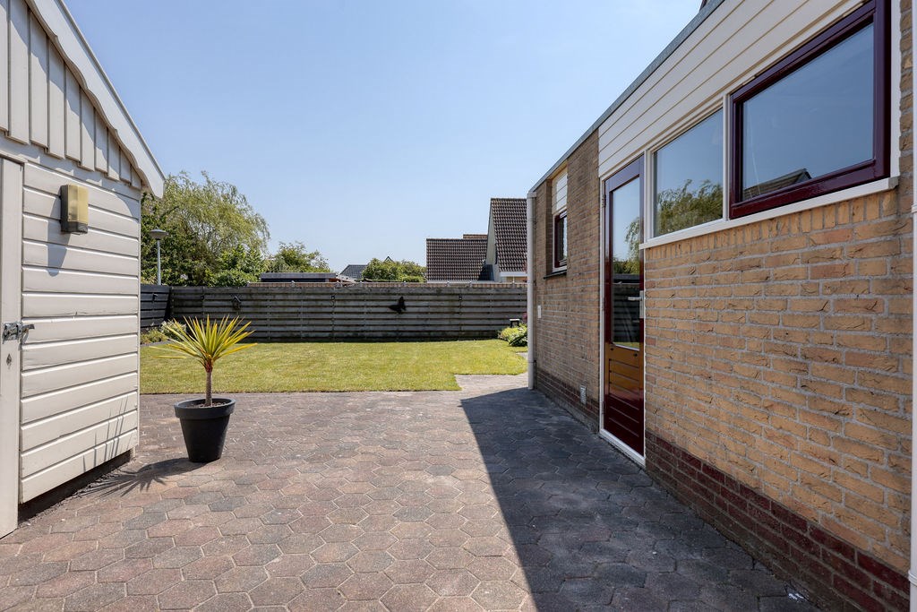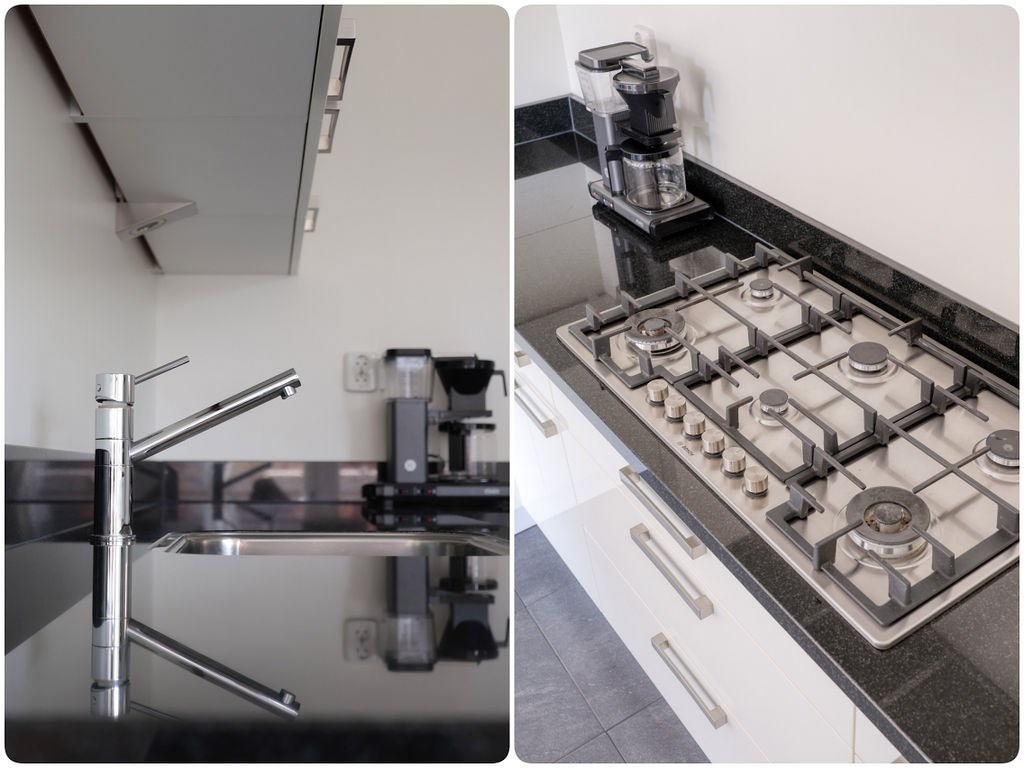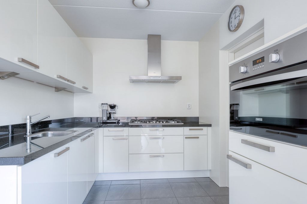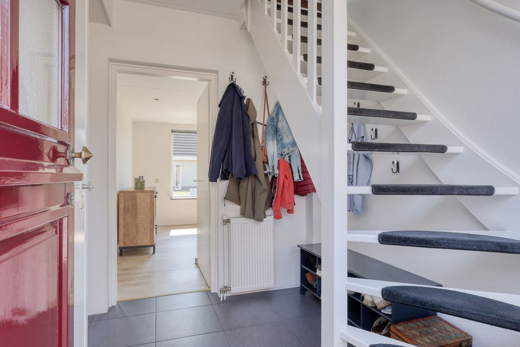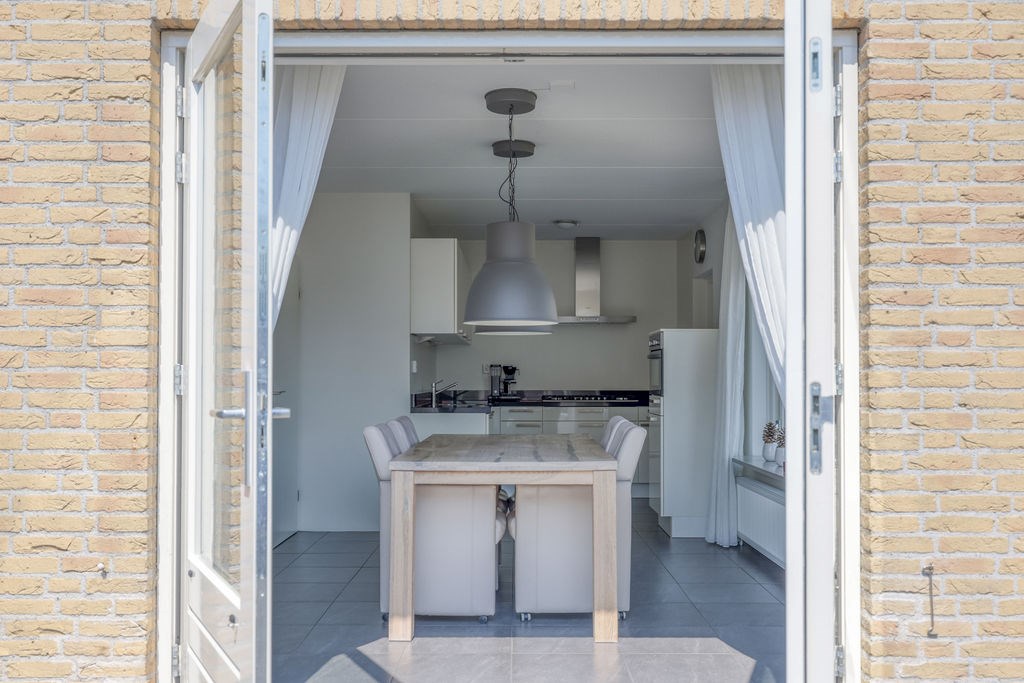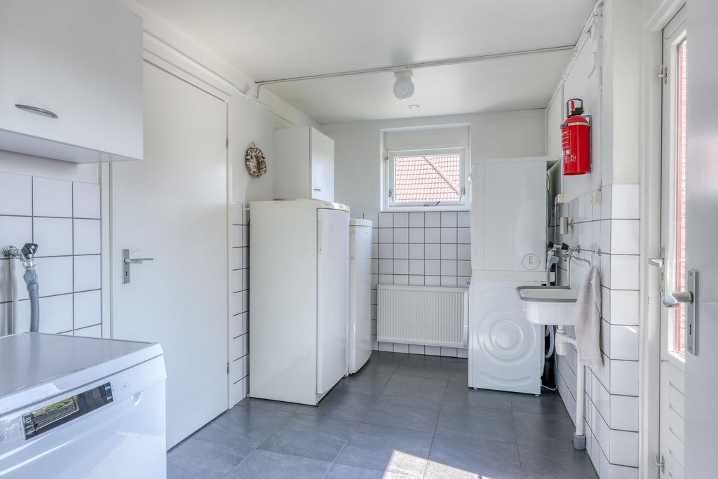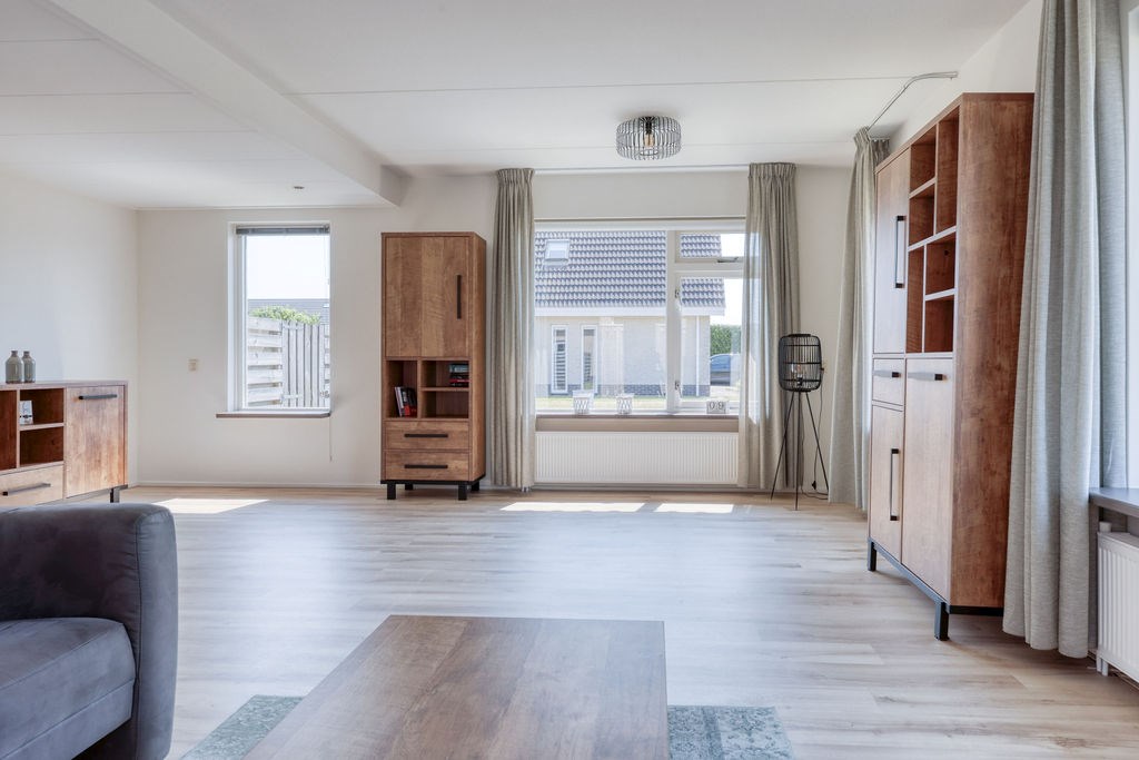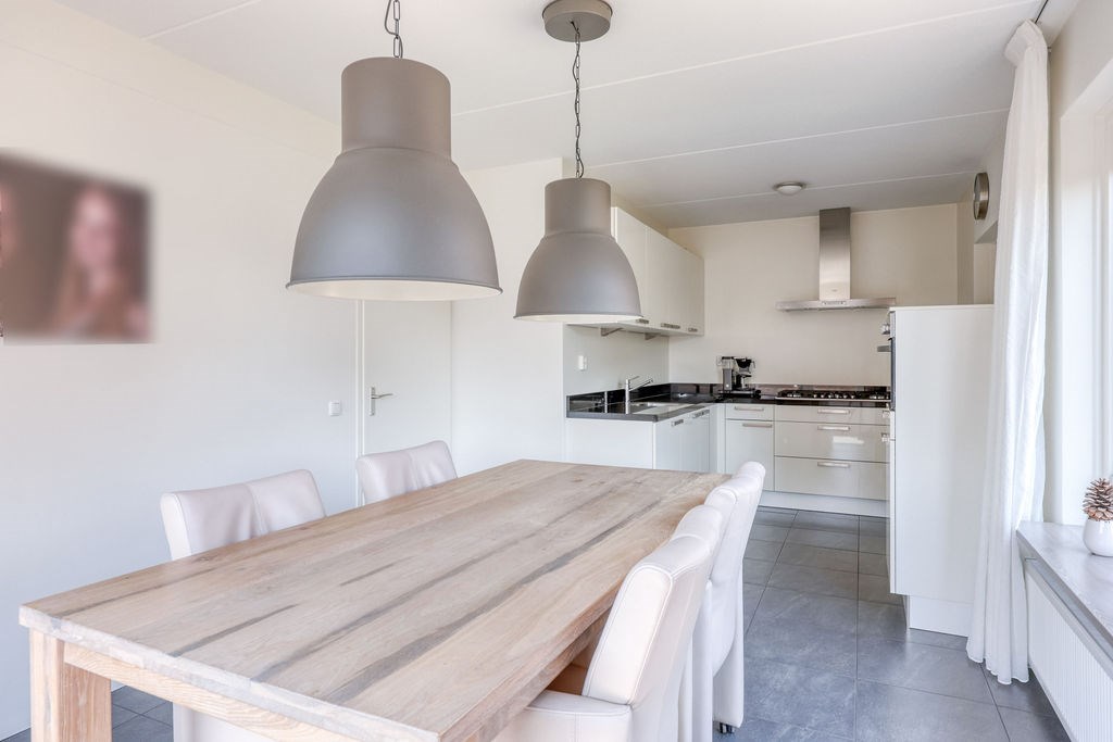 Nadat we de auto op het erf hebben geparkeerd betreden we de woning aan de zijkant en komen in de hal met meterkast, trapopgang en toilet, lopen we door dan komen we in de ruime L-vormige woonkamer, achter de woonkamer is de woonkeuken met openslaande deuren naar het terras op het zuidoosten, de moderne hoekkeuken is uitgevoerd in wit hoogglans met een granieten aanrechtblad en is voorzien van diverse inbouwapparatuur zoals; combimagnetron, gaskookplaat en afzuigkap, aansluitend aan de keuken is de bijkeuken met aansluiting voor wasmachine en droger, vanuit de bijkeuken is er toegang tot de aangebouwde stenen garage van ca. 6.70×3.4 m. Vanuit de bijkeuken en de garage is de achtertuin bereikbaar.