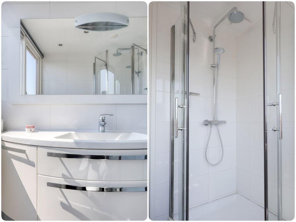De overloop geeft toegang tot 3 de slaapkamers, de master bedroom heeft een grote kastenwand, er is nog een badkamer met douchecabine, 2e toilet en wastafel met meubel, ook de cv-ruimte bevindt zich op de 1e verdieping.