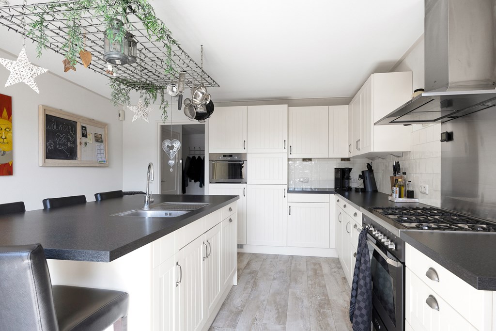 De middelste deur van de entree geeft toegang tot de woning, we komen in de hal met meterkast, inbouwkast en toegangsdeur naar de inpandige garage, rechtdoor in de hal komen we in de ruime bijkeuken met keukenblokje, aansluiting voor de wasmachine en droger, met rechts een toiletruimte met hangcloset en urinoir. Links in de bijkeuken is er toegang tot de trapopgang naar de verdieping en een kleine kamer met daarachter een bergruimte. Lopen we rechtdoor in de bijkeuken dan komen we in de gezellige keuken met hoekopstelling en spoeleiland met bargedeelte. De keuken is voorzien van diverse inbouwapparatuur zoals; koelkast, vrieskast, combimagnetron, fornuis met 6 gaspitten en grote oven, afzuigkap en vaatwasser. Via de schuifpui stap je zo de sfeervolle achtertuin in.