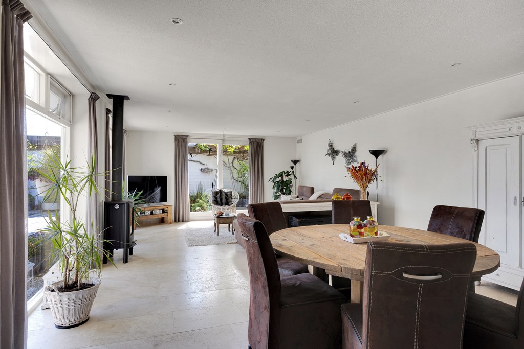 De en suite schuifdeuren met glas in lood geven toegang tot de woonkamer welke is gesitueerd rechts van de keuken, deze is heerlijk ruim en licht, er staat een houtkachel voor de sfeerverwarming en door de schuifpui stap je ook hier weer zo de besloten tuin in. De woonkamer heeft evenals de keuken vloerverwarming.