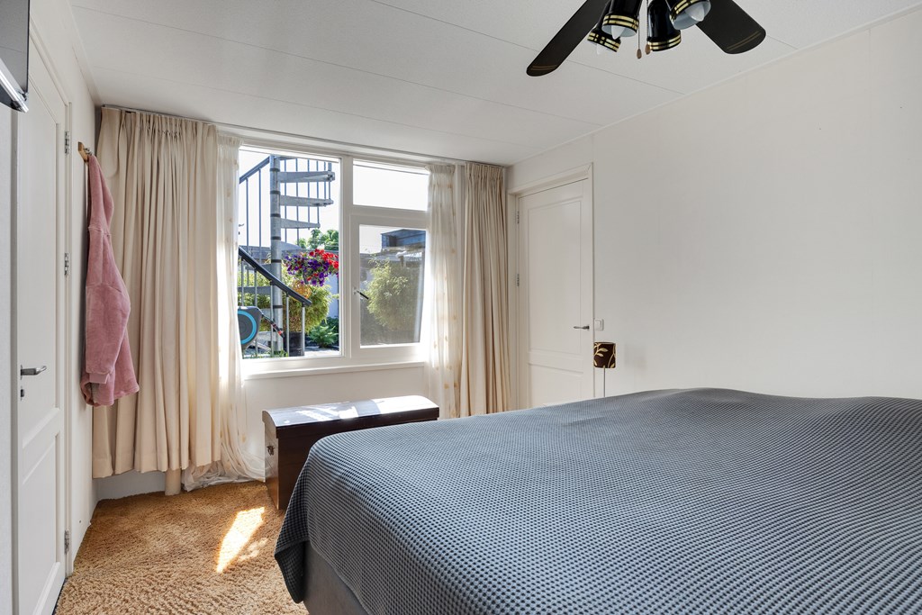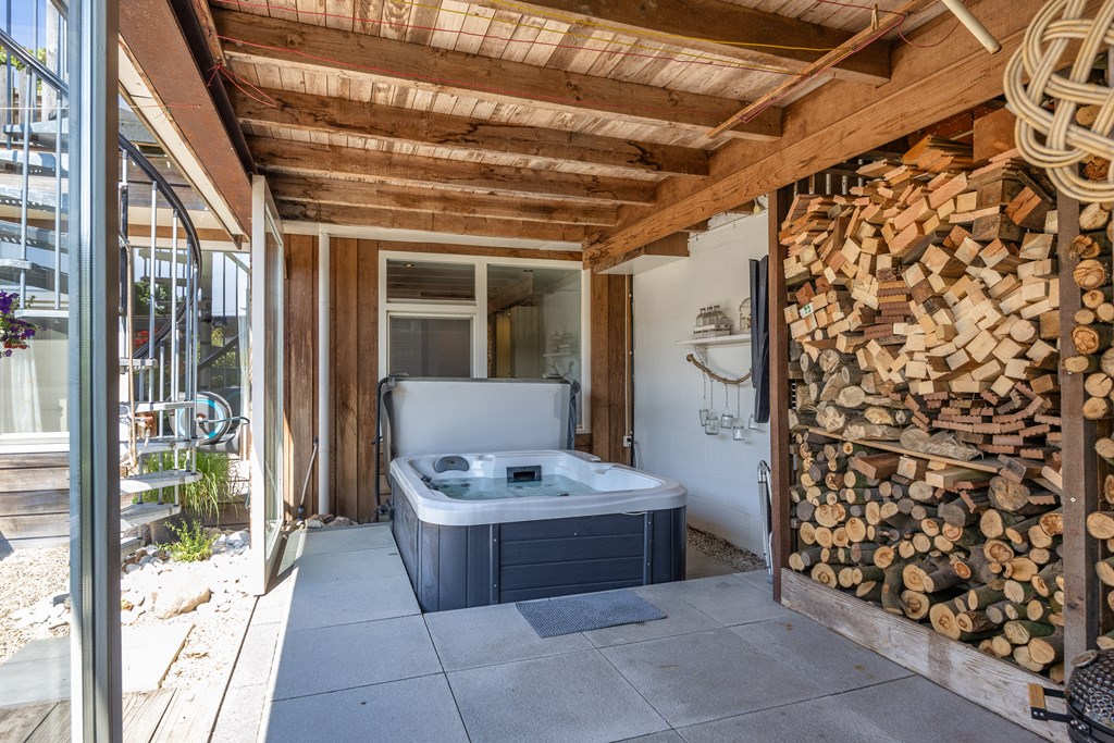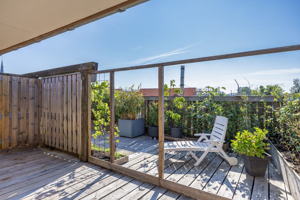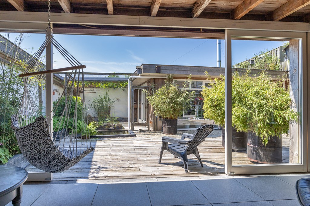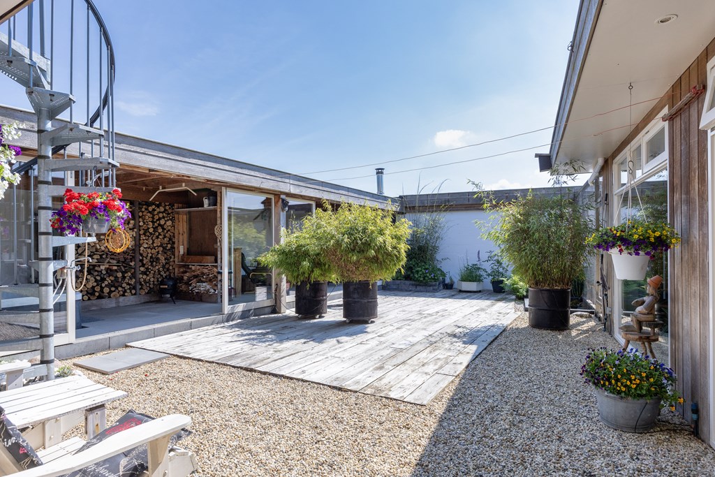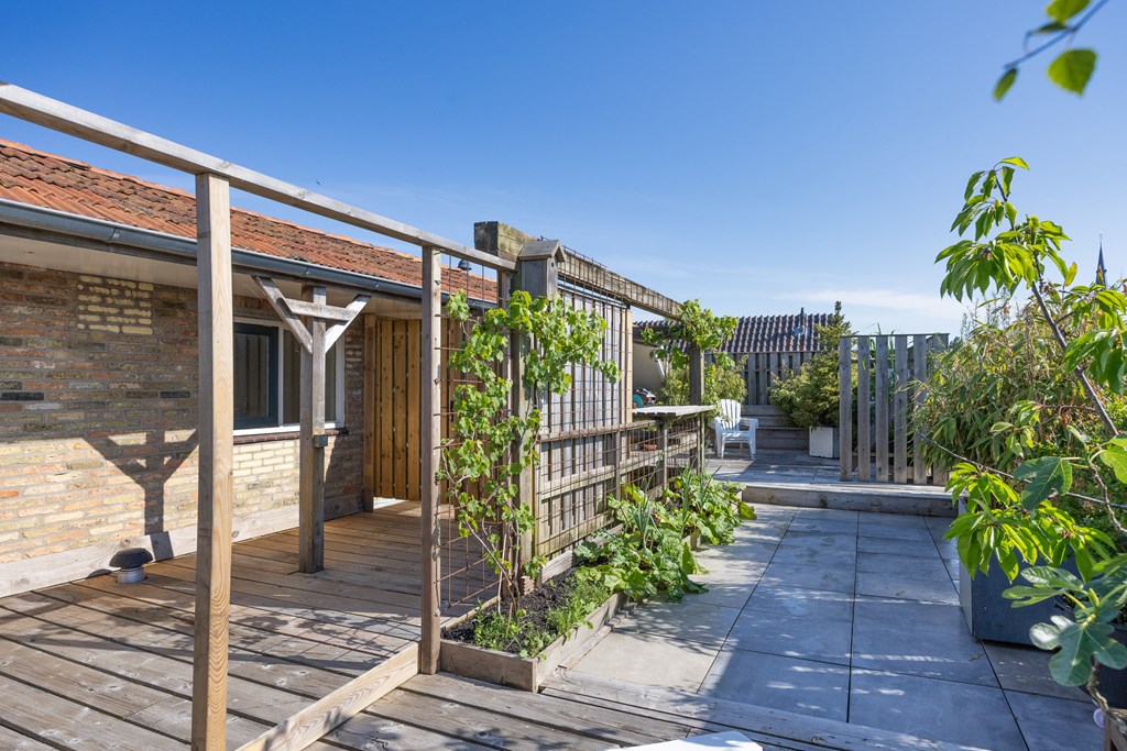 De achtertuin is besloten en biedt veel privacy. De inrichting geeft een mediterrane sfeer weer, de combinatie en het gebruik van de materialen en planten geeft je een vakantiegevoel. Een volière en vijver maken het geheel af. De riante overkapping is een heerlijke ruimte om te genieten, tijdens de koudere dagen steek je lekker de houtkachel aan. De veranda is geheel afsluitbaar door een glazen schuifwand, waardoor je tijdens minder zonnige dagen ook kunt genieten van het buiten zijn. Een wenteltrap geeft toegang tot het riante en sfeervolle dakterras waar je ook veel privacy hebt. Een deel van het dakterras hoort bij het appartement.