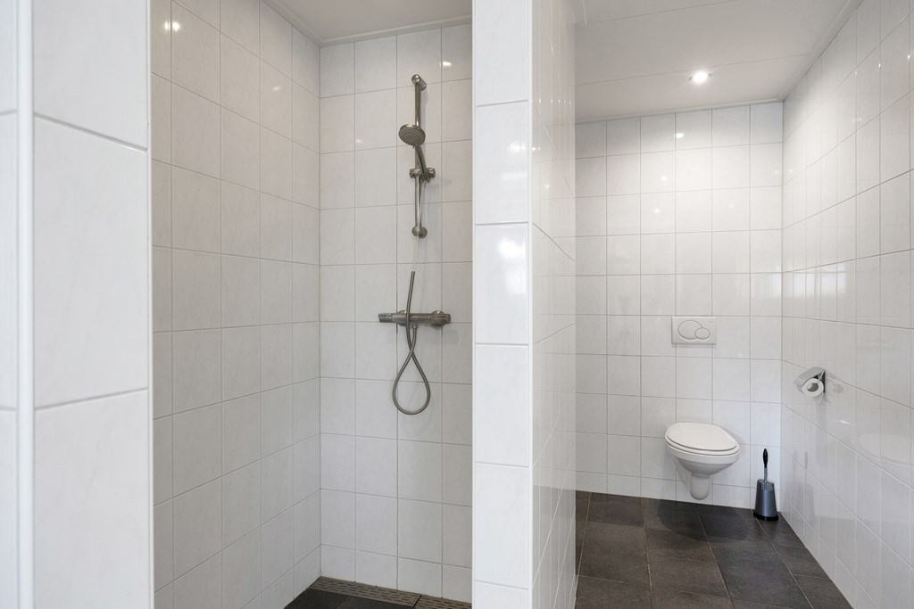 Terug in de keuken is er links toegang tot een slaapkamer met grote inbouwkast en eigen riante badkamer met wastafelmeubel, hangcloset en inloopdouche, ook hier is vloerverwarming aanwezig.