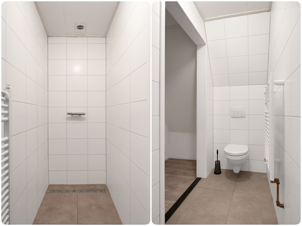 We komen op de overloop welke toegang geeft tot 2 slaapkamers, waarvan 1 met grote inbouwkast, en een badkamer met douchehoek, wastafel met meubel en toilet. Via de overloop is er ook toegang tot het dakterras en via de wenteltrap kun je ook weer in de achtertuin komen.