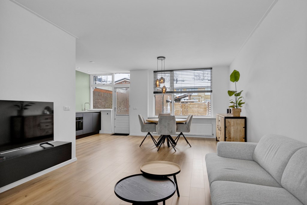We betreden de woning via de voordeur en komen in de hal met toilet, meterkast, trapopgang en toegang tot de woonkamer met open keuken. De woonkamer is heerlijk licht door de grote raampartijen aan zowel de voor- als achterkant. De moderne keuken is voorzien diverse inbouwapparatuur zoals; koelkast, vrieskast, inductiekookplaat, afzuigkap, vaatwasser en oven. Via de achterdeur kom je in de achtertuin met berging en er is een achterom via de steeg.