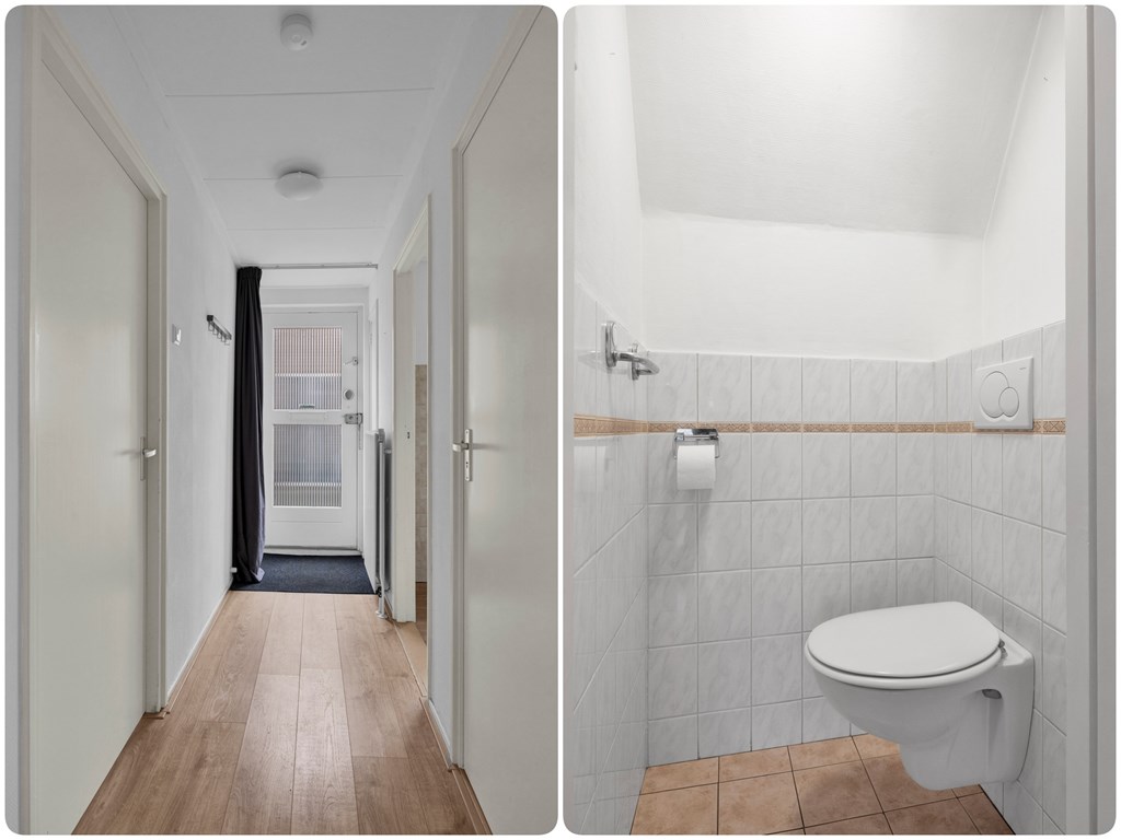 We betreden de woning via de voordeur en komen in de hal met meterkast en toegang tot het toilet en de slaapkamer met wastafel. Rechts van de hal bevindt zich de woonkamer, een knusse en sfeervolle leefruimte met enkele inbouwkasten. Links van de hal bevindt zich de keuken, deze heeft een hoekkeukenopstelling welke is voorzien van diverse inbouwapparatuur zoals; koelkast, gaskookplaat, afzuigkap en vaatwasser. Via de keuken is ook de trapopgang toegankelijk. Achter de keuken bevindt zich de bijkeuken met cv-installatie en aansluiting voor de wasmachine en droger, tevens toegang tot de achtertuin. Via de bijkeuken kom je in de badkamer met 2e toilet, douche en wastafelmeubel.
