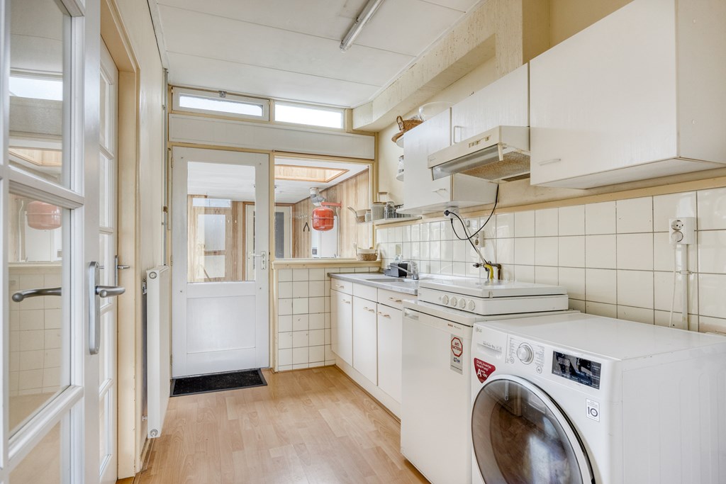 We betreden de woning aan de voorzijde en komen in de hal met meterkast, toilet, trapopgang en toegang tot de keuken met eenvoudig keukenblok en kelderkast. Links van de keuken bevindt zich de doorzon woonkamer met eiken plankenvloer, de grote raampartijen aan de voor- en achterzijde zorgen voor veel lichtinval. Achter de keuken bevindt zich de bijkeuken met cv-installatie en aansluiting voor de wasmachine. Achter de bijkeuken is een ruime stenen berging.