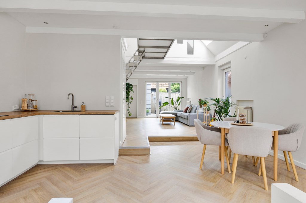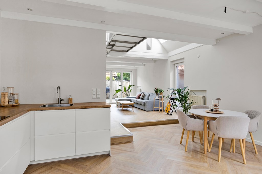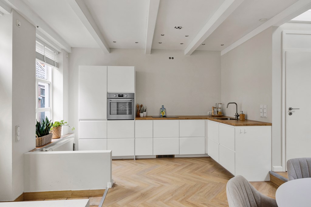 Nadat we de auto geparkeerd hebben aan de rand van de stad komen we middels een korte wandeling bij de woning en betreden we deze via de voordeur in het midden van de fraaie witte voorgevel. We komen direct in de woonkeuken met links de in 2024 nieuw geplaatste moderne greeploze hoekkeuken met veel opbergruimte, welke voorzien is van diverse inbouwapparatuur zoals; koelkast, vrieskast, inductie kookplaat met geïntegreerde afzuiging, vaatwasser en combimagnetron. Achter de keuken bevindt zich de cv-ruimte/provisiekast.