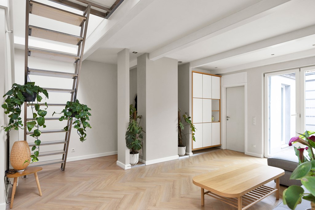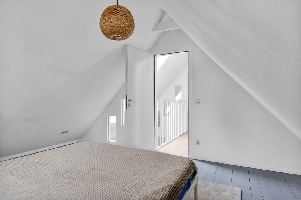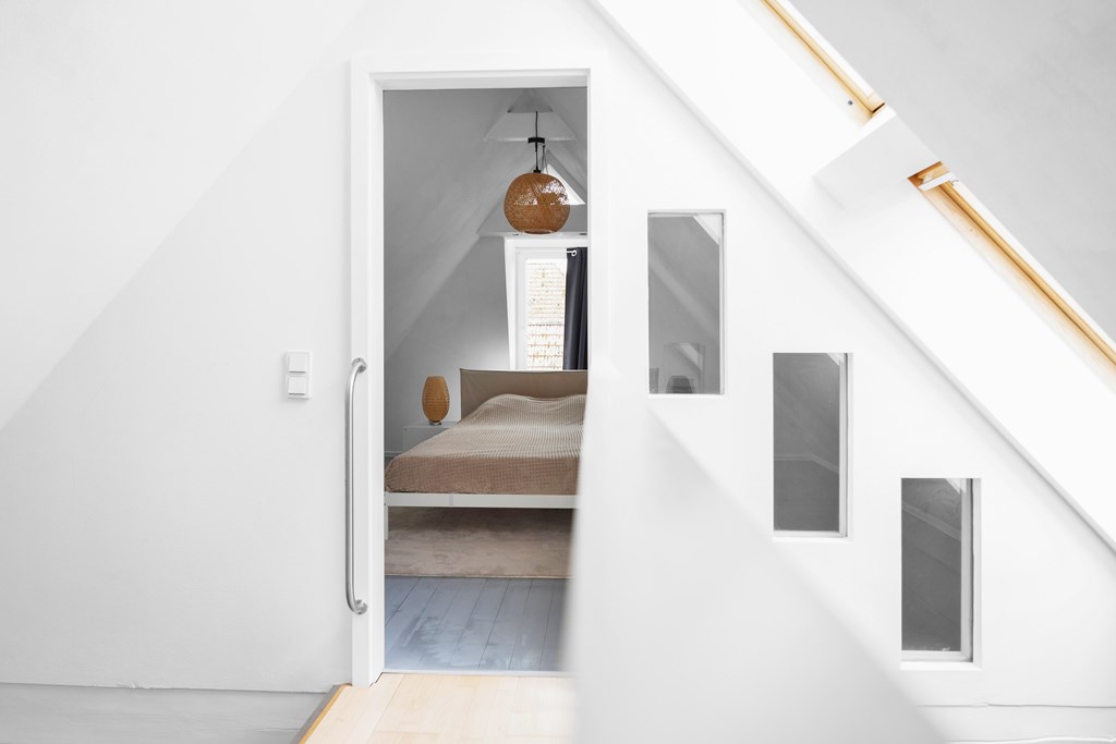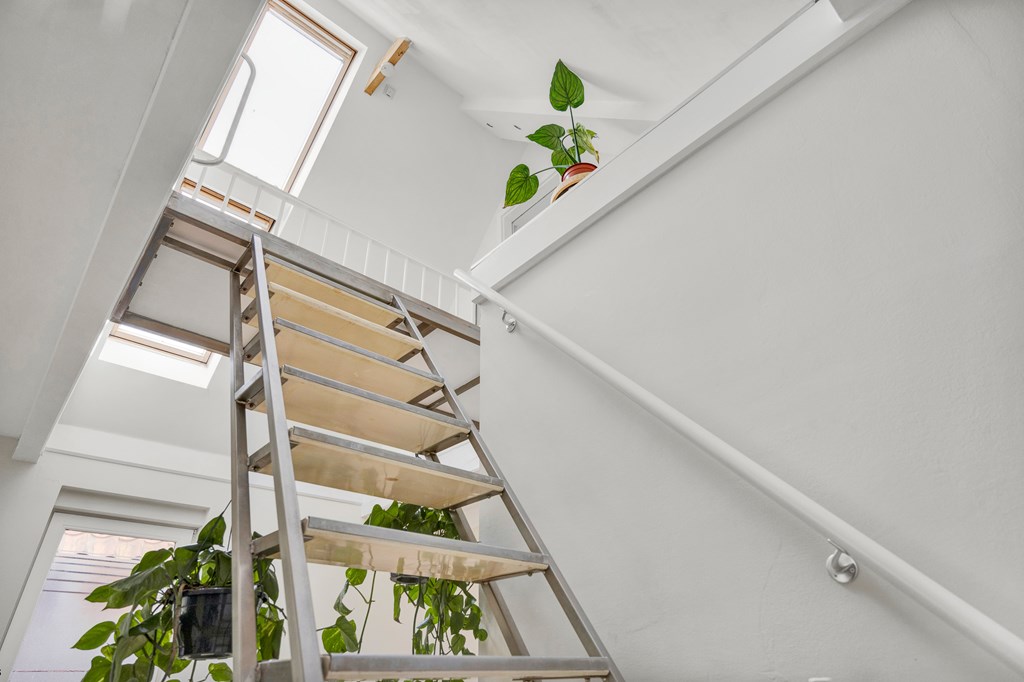 De open rvs-trapopgang brengt ons naar de verdieping, een moderne loopbrug scheidt de 2 slaapkamers van elkaar en geeft een fraai zicht op de begane grond.