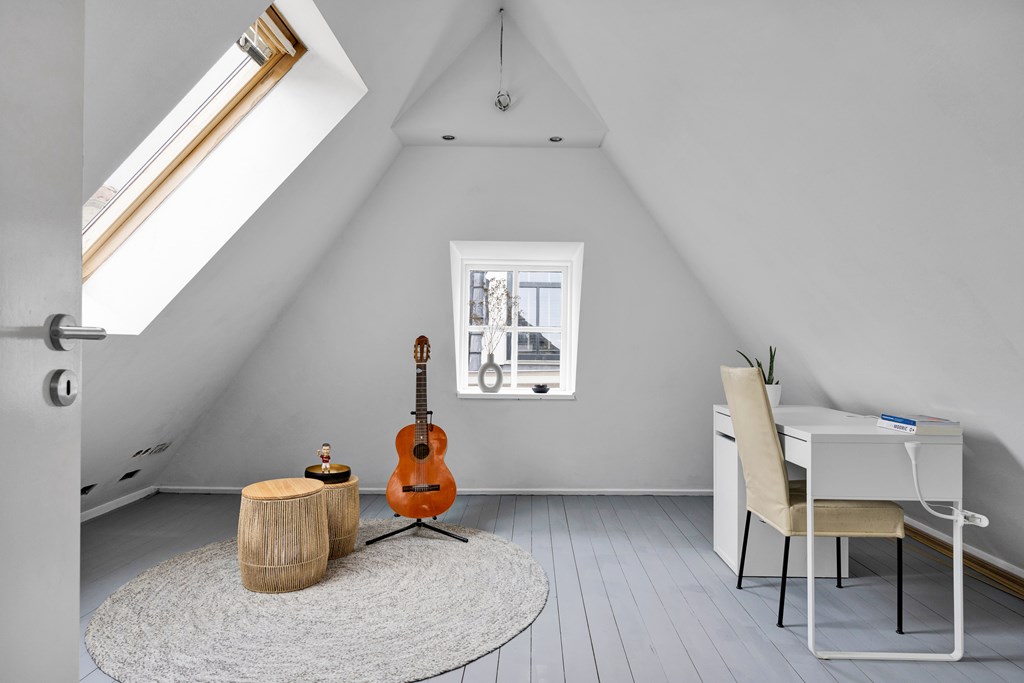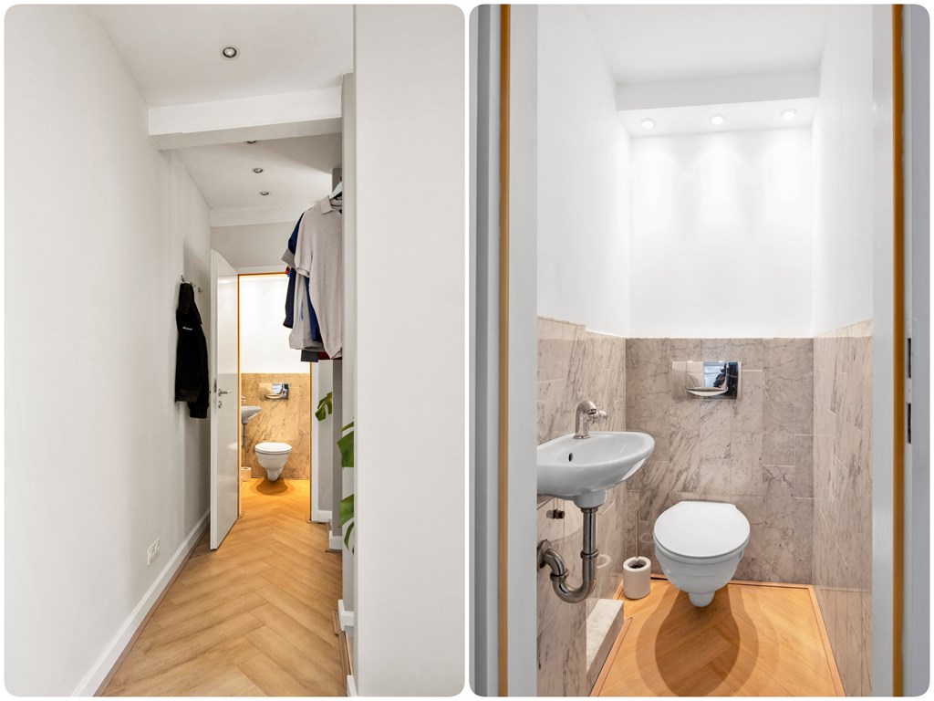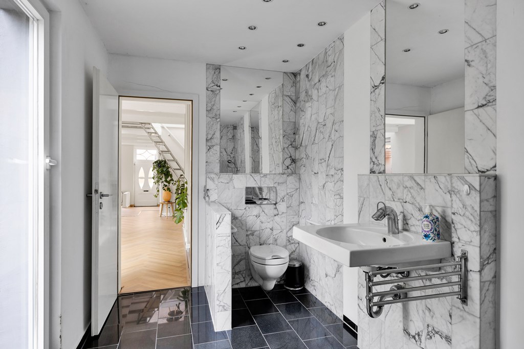 Aansluitend aan de woonkeuken bevindt zich de woonkamer, deze is gesitueerd aan de achterzijde en is heerlijk licht door de grote raampartij aan de achterzijde met openslaande deuren naar de patio/achtertuin op het zuiden. De woonkamer is deels open tot de nok, wat een ruimtelijk gevoel geeft. Het toilet is toegankelijk middels een kleine hal naast de woonkamer en de badkamer bevindt zich aan de achterzijde in de uitbouw, deze is ruim en voorzien van een douche, 2e toilet, wastafel en de aansluiting voor de wasmachine, tevens een loopdeur naar de patio.