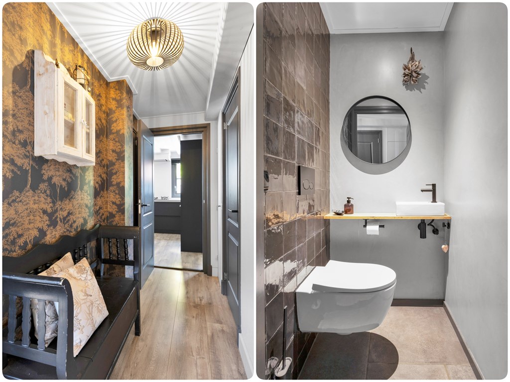 Nadat we de auto geparkeerd hebben aan de rand van de stad, komen we middels een kleine wandeling bij de woning en betreden we deze via de voordeur en komen in de hal met trapopgang, toilet, meterkast, luxe badkamer met dubbele wastafel met meubel, ligbad en riante inloopdouche met dubbele douchefunctie, rechts van de hal is er ook toegang tot de berging (voormalige garage) met openslaande deuren naar buiten/voorzijde.