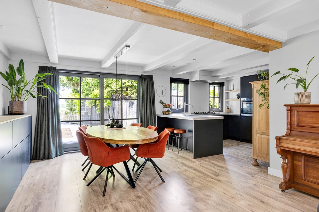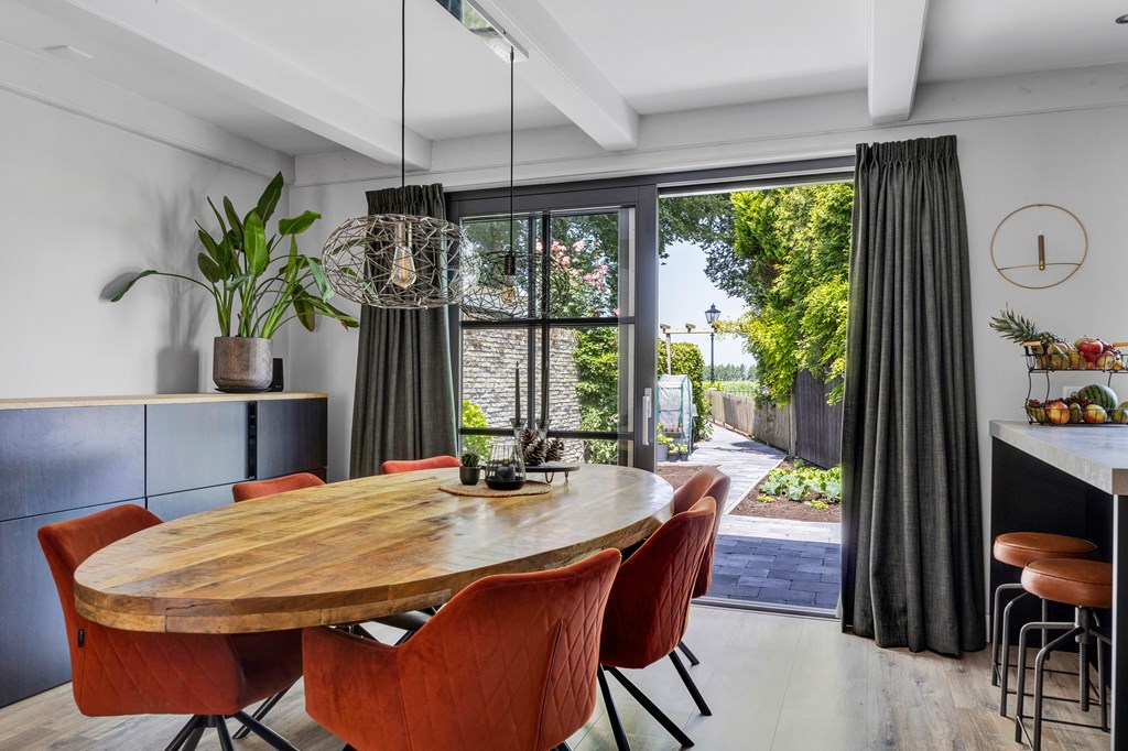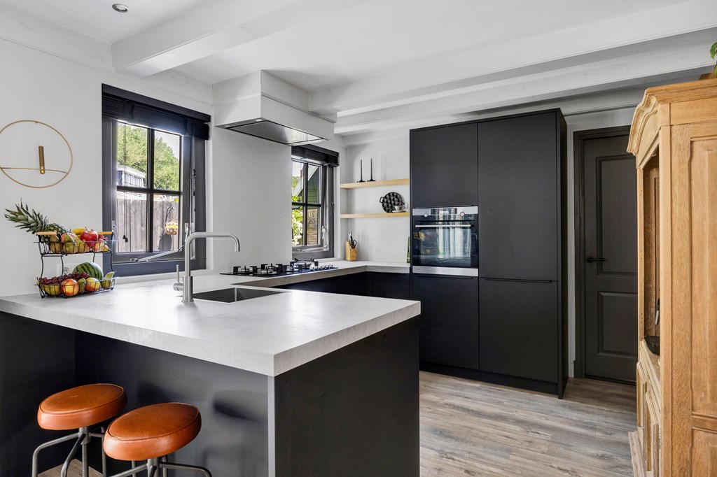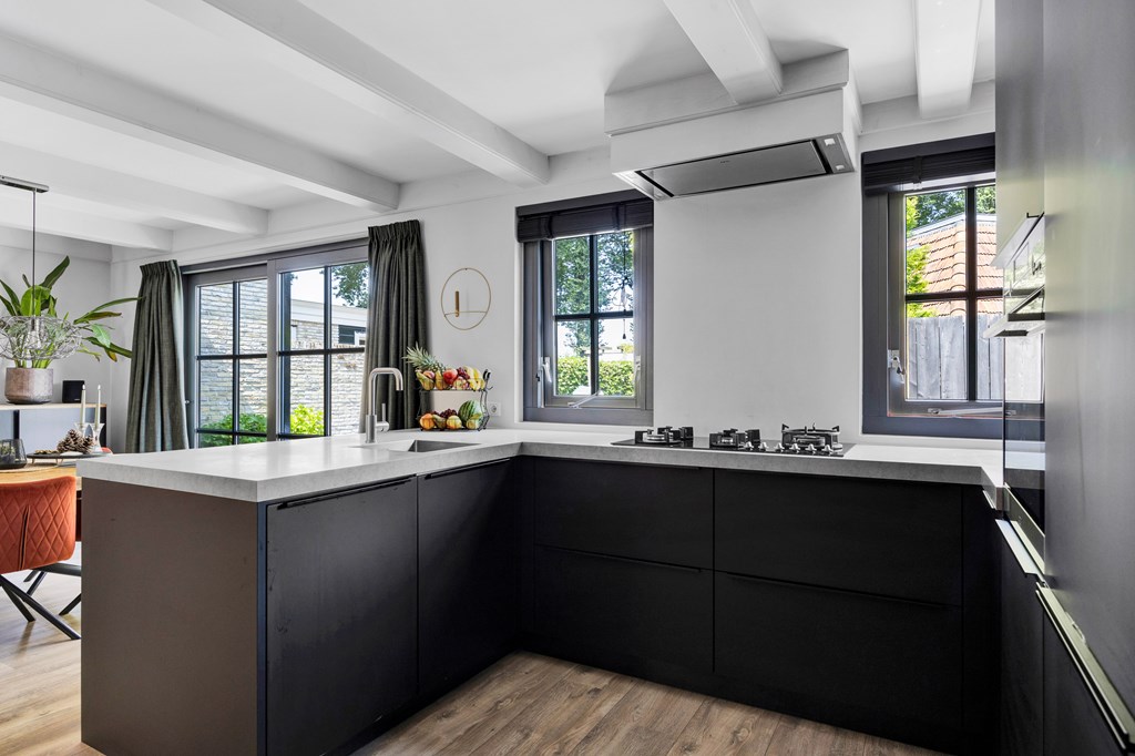 Links van de hal bevindt zich de riante woonkamer met schuifpui aan de achterzijde, je stapt zo de recent aangelegde tuin in, de moderne U-vormige keuken is open en staat in verbinding met de woonkamer, het spoelgedeelte heeft tevens een barfunctie met barkrukken voor een gezellig samenzijn tijdens het kokkerellen. De keuken is verder voorzien van diverse inbouwapparatuur zoals; koelkast, vrieskast, gaskookplaat, afzuigkap, vaatwasser en oven.