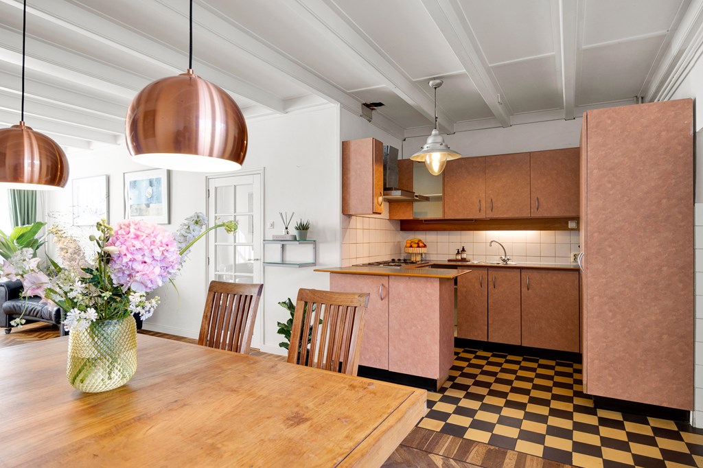 Nadat we de auto geparkeerd hebben aan de rand van de stad komen we d.m.v. een kleine wandeling door het prachtige Sloten bij de woning en betreden deze via de voordeur. We komen in de lange hal met meterkast, trapopgang en trapkast, rechts bevindt zich de woonkamer met prachtige traditionele visgraatvloer en natuurlijk dat karakteristieke balkenplafond wat een fijne authentieke sfeer geeft. De openslaande deuren aan de achterzijde geven toegang tot de riante achtertuin en terras. De open keuken heeft een U-vormige opstelling en is voorzien van diverse inbouwapparatuur zoals; koelkast, gaskookplaat, afzuigkap en vaatwasser. De bijkeuken bevindt zich achter de keuken en heeft een aansluiting voor de wasmachine en droger, er is tevens een toilet, achter de bijkeuken bevindt zich een kleine slaapkamer/kantoor.