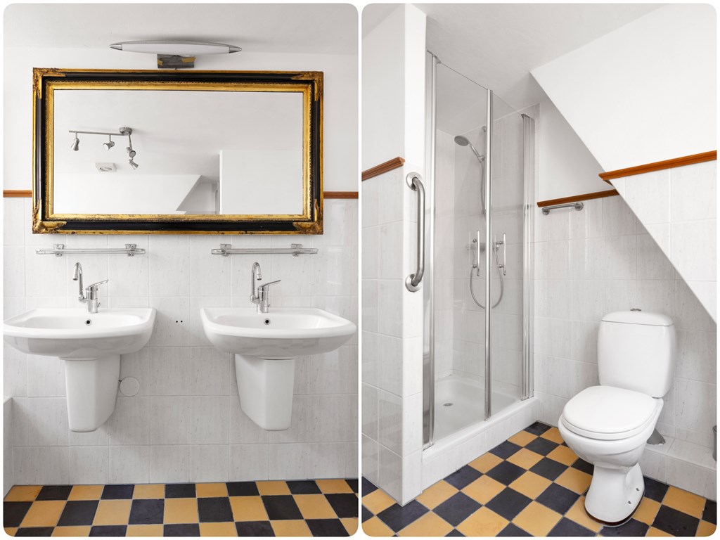 De overloop geeft toegang tot de 2 slaapkamers op de verdieping, de achterste slaapkamer heeft toegang tot het dakterras, de voorste slaapkamer heeft een ruime kastenwand. Er is tevens nog een badkamer met vloerverwarming, douche, ligbad, dubbele wastafel en 2e toilet.