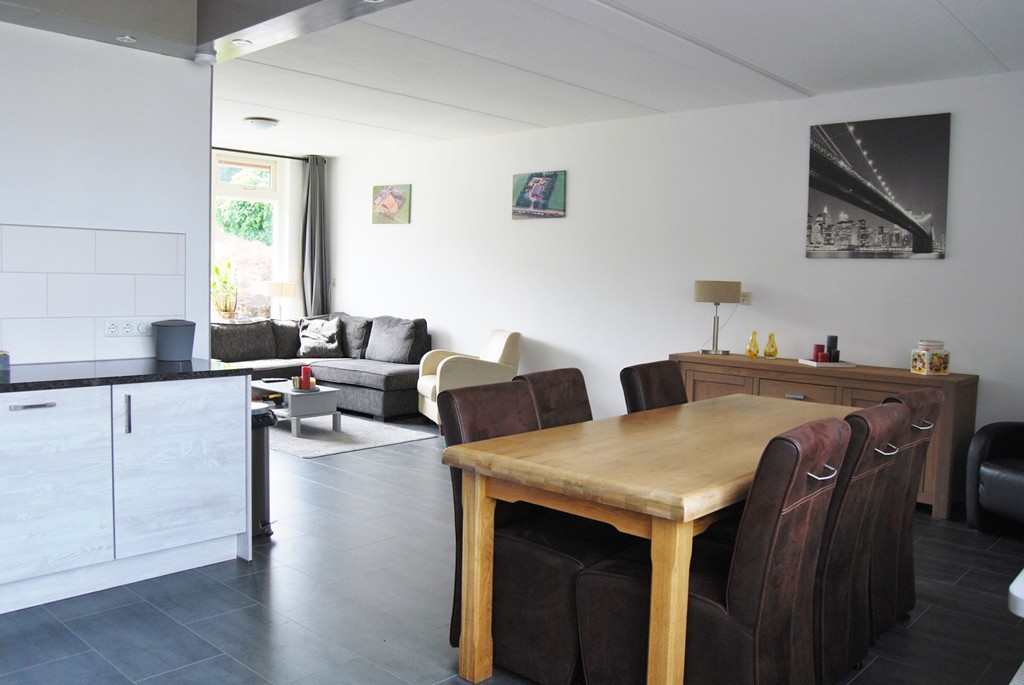 Entree, ruime hal, meterkast, trapopgang, toilet, badkamer met douche en wastafel, L-vormige woonkamer, ruime eetkeuken met openslaande deuren naar tuin en terras, moderne keuken in hoeksopstelling met granieten aanrechtblad en diverse inbouwapparatuur zoals; koelkast, vrieskast, combimagnetron, gaskookplaat, afzuigkap en vaatwasser, ruime bijkeuken met aansluiting voor wasmachine en droger.