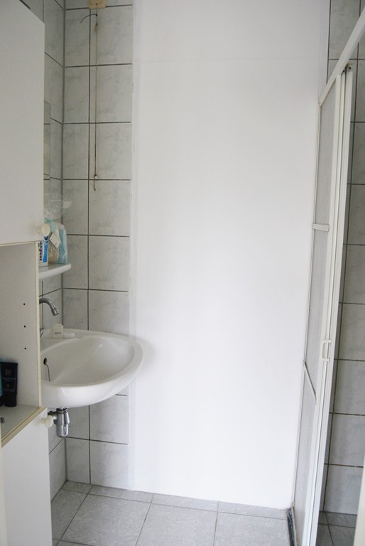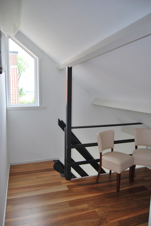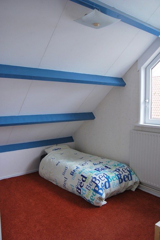 Overloop, 2 slaapkamers, waarvan de grote slaapkamer bergruimte achter de schuine wand heeft.