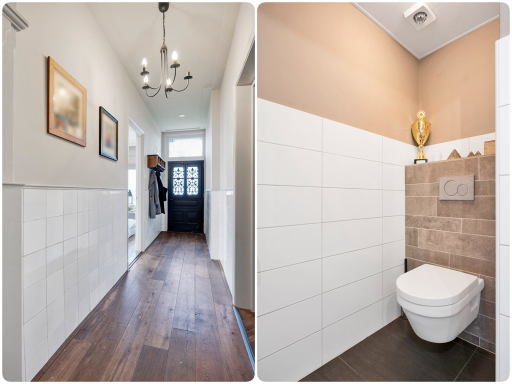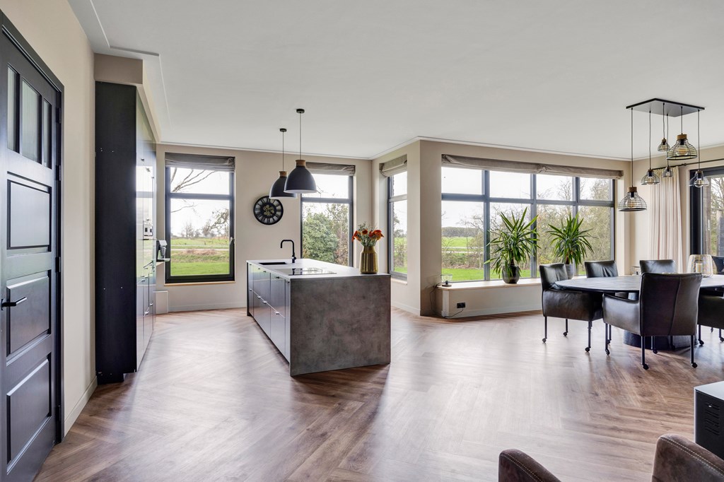 Nadat we de auto geparkeerd hebben op het ruime erf met parkeerplaatsen betreden we de woonboerderij via de zijdeur, de woning is ook te betreden via de voordeur. Via de zijdeur komen we in de hal met modern toilet met hangcloset, inbouwkast, knusse woonkamer/tv-kamer met plankenvloer en riante woonkeuken met visgraatvloer en nieuwe keukenopstelling van 2024 met kook/spoeleiland met inductiekookplaat met afzuiging, vaatwasser en Quooker, de keukenkastenwand bevat naast veel opbergruimte ook nog een magnetron, oven, koelkast en vrieskast, naast de kastenwand is nog een koffiecorner. In de woonkeuken is vloerverwarming aanwezig en er staat een pelletkachel, tevens is de woonkeuken voorzien van triple glas en is er een grote schuifpui naar het ruime terras.