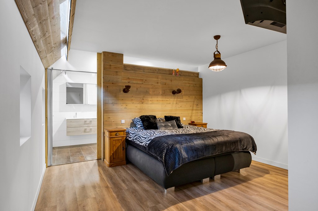 Via de woonkeuken is het achterste gedeelte, de voormalige deel/stal van de woonboerderij toegankelijk, hier bevindt zich een lange gang welke toegang geeft tot; links een bijkeuken met aansluiting voor de wasmachine en droger, een extra kamer met schuifpui naar buiten, dit is een ideale hobbyruimte/extra slaapkamer etc. Rechts van de gang is een ruime showroom met eigen toegang en een kantoor. Terug in de gang is er rechts nog een kantoor/slaapkamer en toegang tot de volledig geïsoleerde werkplaats. De gang geeft tevens nog toegang tot een riante slaapkamer met inloopkast, en-suite badkamer voorzien van dubbele douche, dubbele wastafel met meubel en toilet.