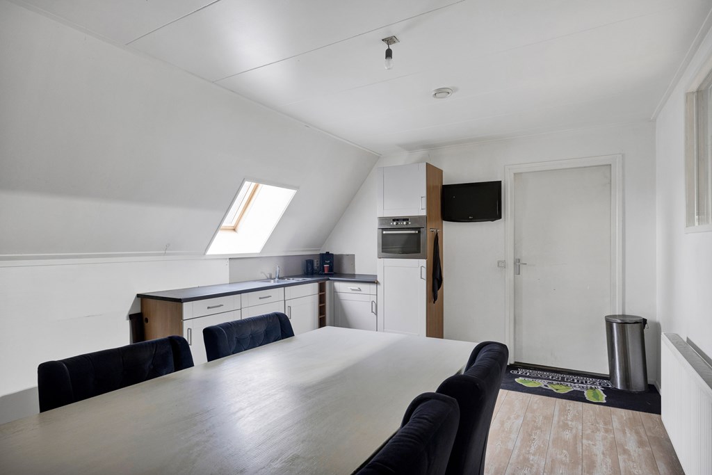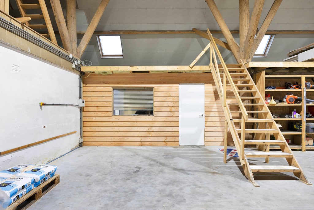 Via de vaste trap in de werkplaats kom je op de verdieping, hier bevindt zich een toilet en een kantine/kantoor met keukenblok.