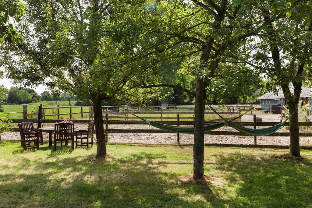 In de achtertuin staat o.a. nog een houten schuur, een overkapping bij het terras, een fietsenstalling voorzien van water en elektra, en er is een waterput. De achterste kavel is voorzien van drainage, er is een paarden paddock Paradise, een weide en grote stal welke gebouwd is in 2005.