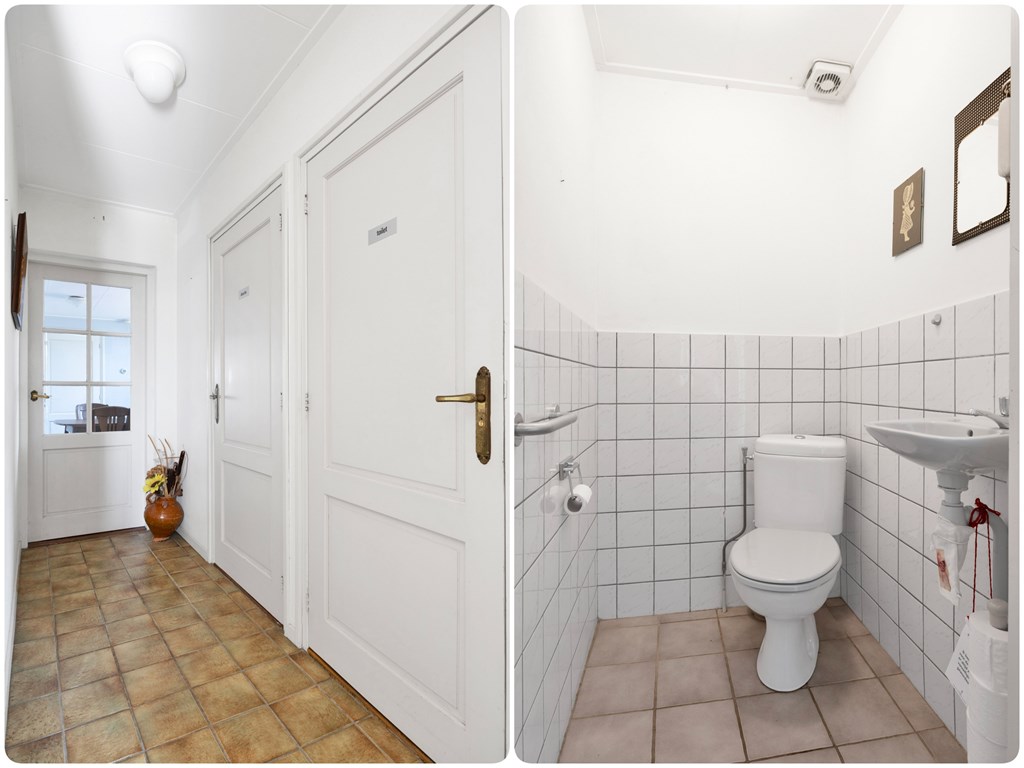We betreden de woning via de voordeur en komen in de hal met meterkast en trapopgang, rechts van de hal is een ruime slaapkamer, een toilet en een badkamer met ligbad, inloopdouche en wastafel met meubel. Links van de hal bevindt zich de ruime en lichte woonkamer met schouw met sfeerkachel en openslaande deuren naar de achtertuin.