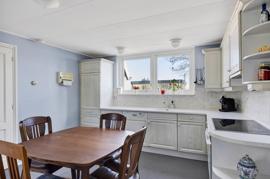 De eetkamer/keuken is ruim en heeft een hoekkeukenopstelling, tevens toegang naar de achtertuin en achtergelegen zeer ruime bijkeuken met klein aanrechtblokje en aansluiting voor de wasmachine en droger. De woning is via de bijkeuken als achterom ook toegankelijk. Via de bijkeuken is er toegang tot de inpandige schuur/garage met dubbele openslaande deuren.